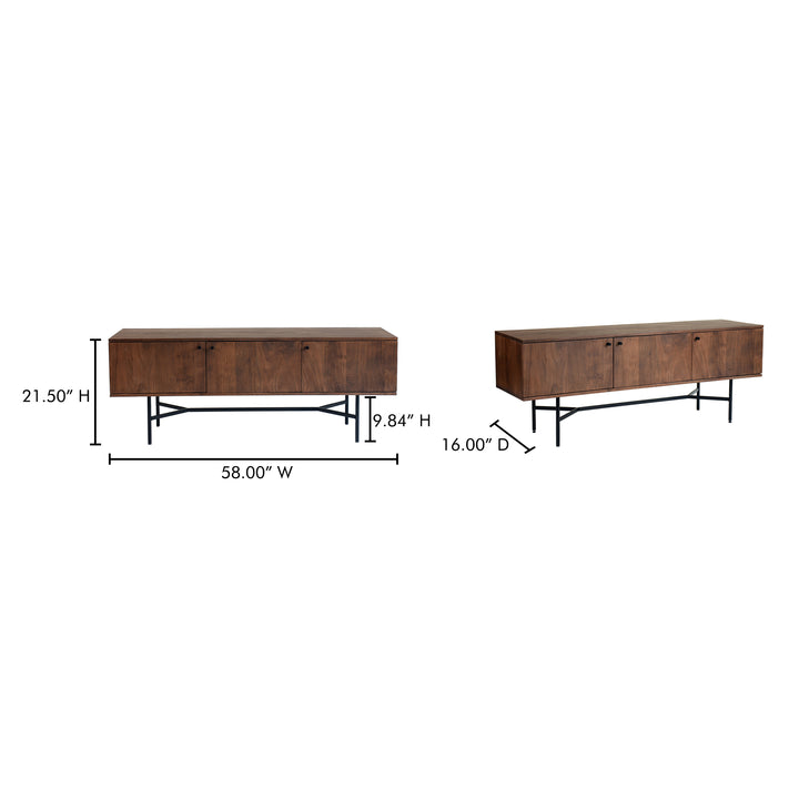 Upgrade your living space with the NADAAL STUDIOS Alaric Media Cabinet, a perfect fusion of modern style and practical storage. Crafted from solid acacia wood, this media cabinet is both durable and elegant, showcasing a rich brown finish and industrial-inspired metal legs. Featuring three doors with magnetic catches for smooth closure, the Alaric offers ample storage space for media devices, books, or decorative items, making it an ideal addition to any contemporary home. Its black-powder finished metal handles and legs add an industrial-chic touch, creating a modern classic that blends effortlessly with mid-century or contemporary interiors. Whether used as an entertainment console or a stylish storage unit, the Alaric Media Cabinet brings sophistication and functionality to any room.