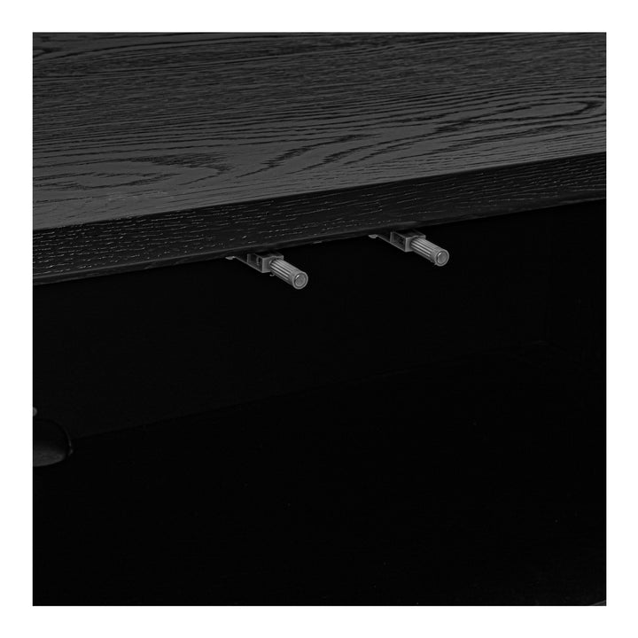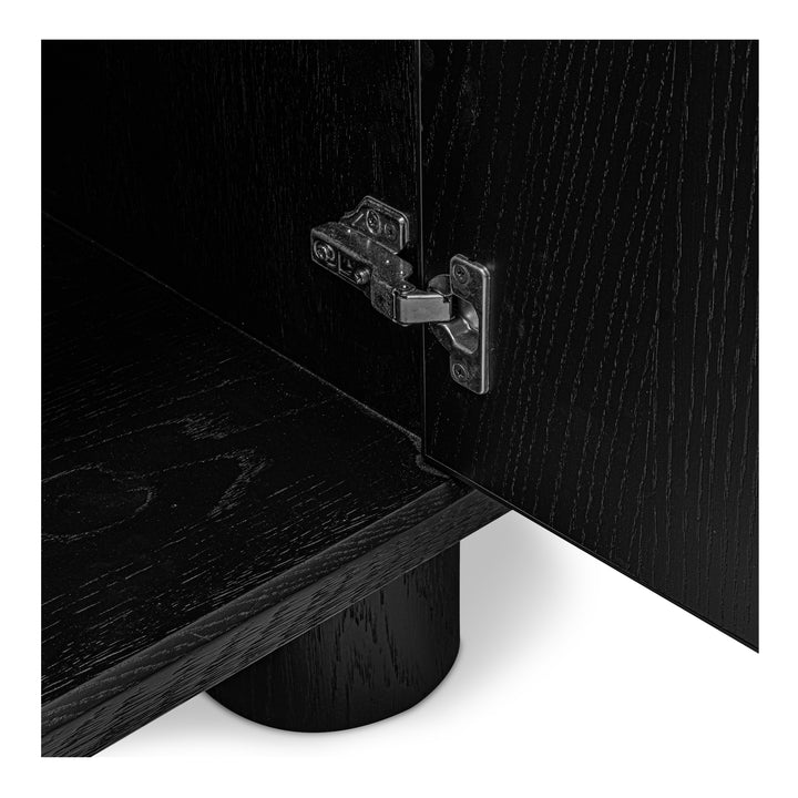With its sleek black shagreen doors framed by wire-brushed oak and accented in antique gold, the Alarno sideboard embodies bold sophistication. Its minimalist structure and repeated leg motif create visual stability and rhythm. Push-to-open doors hide organized storage, while subtle metallic details elevate the overall form. A true statement of contrast and balance, Alarno brings tactile luxury and architectural finesse to dining and living areas alike.