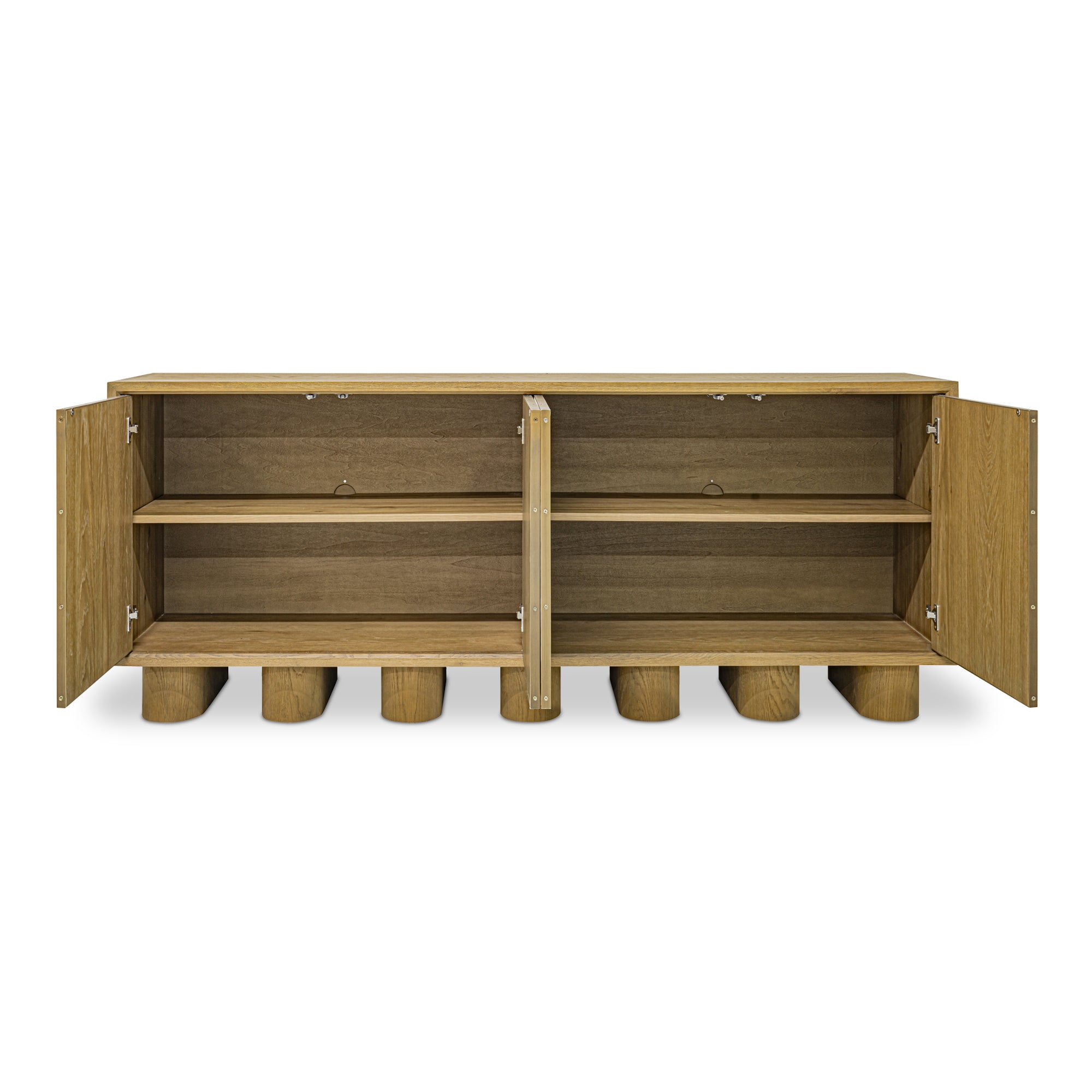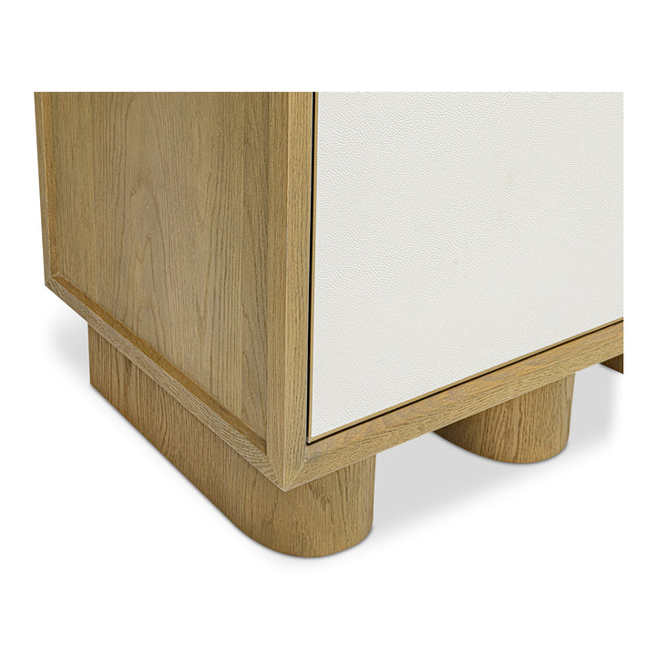 Alarno blends refined texture with sculptural geometry. Its minimalist body features playful, chunky legs in wire-brushed oak surrounding white shagreen-patterned doors. A gleaming antique gold metal frame threads between these layers, offering both warmth and contrast. Push-to-open doors conceal spacious storage with integrated cable openings. Elegant yet approachable, Alarno makes a bold statement in any setting—from dining rooms to living spaces—embodying artful restraint and modern versatility.