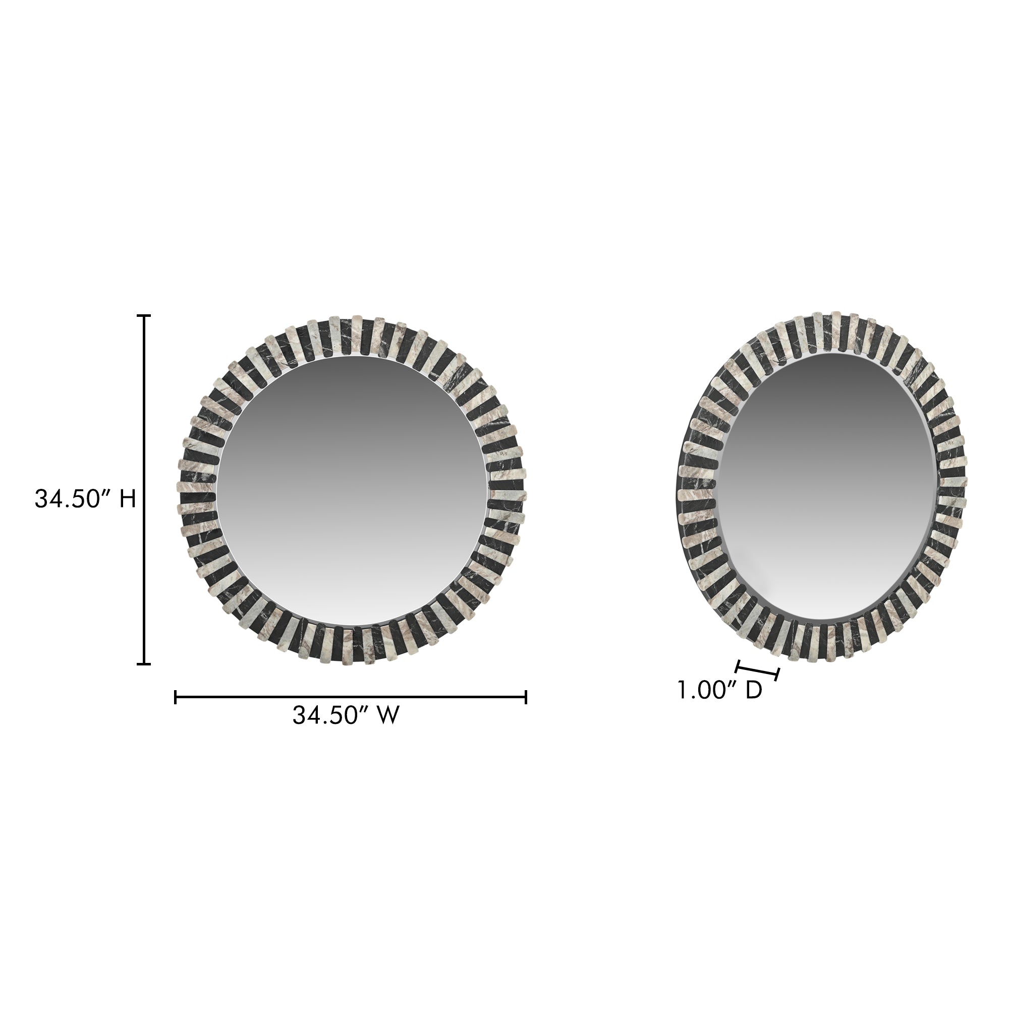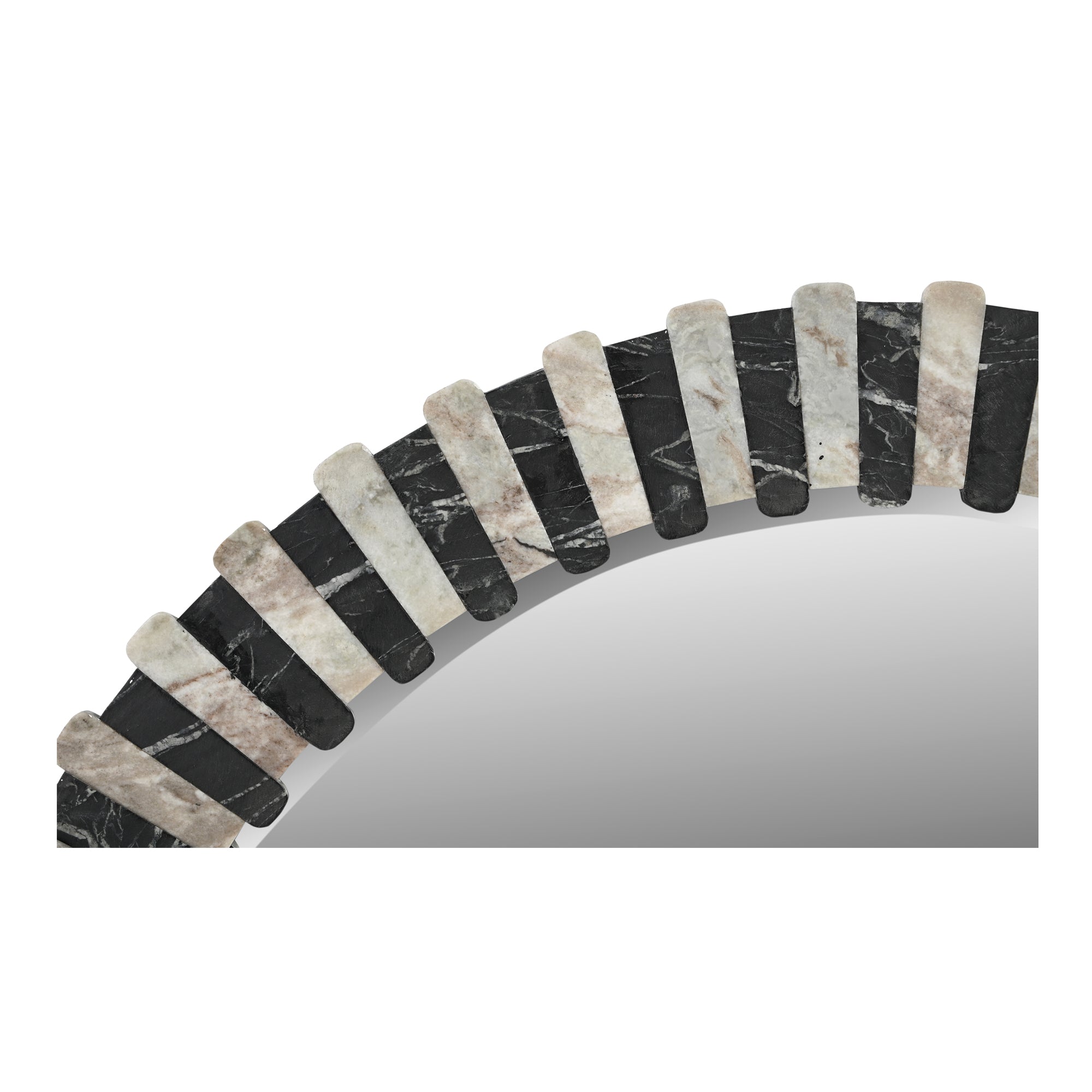 Redefine sophistication in your home with the Nadaal Studios Alcott Wall Mirror, a stunning blend of craftsmanship and design. This elegant mirror features a hand-laid combination of Torrento marble and black marble in a luxurious matte leathered finish, creating a striking interplay of light and dark tones. The alternating marble pattern captures the essence of Art Deco, making it a bold yet timeless statement piece. Supported by a durable MDF back and outfitted with bar hanging hardware, the Alcott Wall Mirror seamlessly merges function with style. Whether placed in your living room, entryway, or bedroom, it elevates your décor with its refined elegance. With its high-quality materials and meticulous craftsmanship, the Alcott Wall Mirror is more than just a mirror – it’s a work of art designed to transform your space.