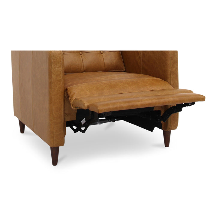 Sleek in form and rich in texture, the Ariadne Power Recliner Chair in Tan Leather delivers a luxurious seating experience rooted in mid-century elegance. Crafted with 100% top grain leather in a waxed vintage finish, this chair pairs a tailored profile with exceptional function. A slim solid red Meranti wood frame provides a warm contrast to the leather, while clean lines and a six-button tufted back emphasize its timeless character. Inside, an Okin power motion mechanism activates both left and right footrests with seamless touch control built into the arms. Foam core seating with feather and fiber fill ensures long-lasting comfort. With a 52.5-inch power cord and extension cable included, Ariadne is ready to adapt to your lifestyle.