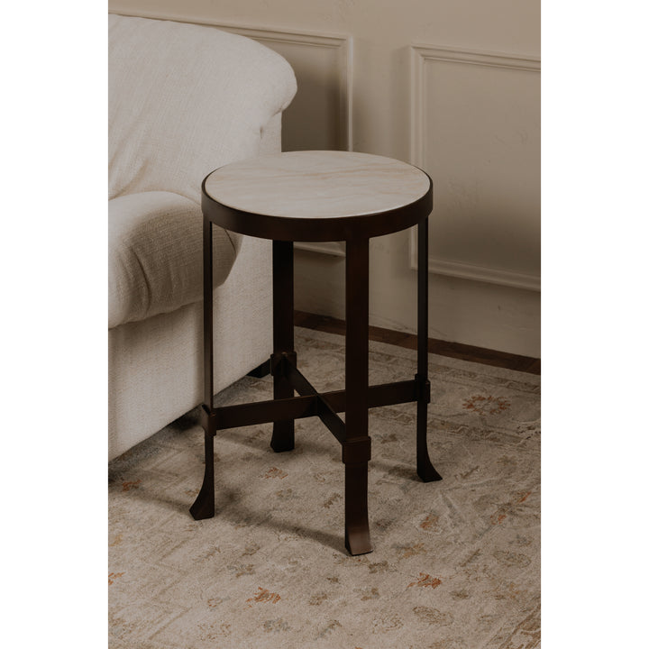 Shape a calm landing spot beside the sofa with the Caelin Side Table in white marble — a compact piece that brightens and refines without crowding the room. The marble top rests within a slim metal rim, while curved legs connect with buckle-like stretchers for subtle dimension. Use it as an end table or reading-corner companion; the clean lines and natural stone variation make each table uniquely yours.