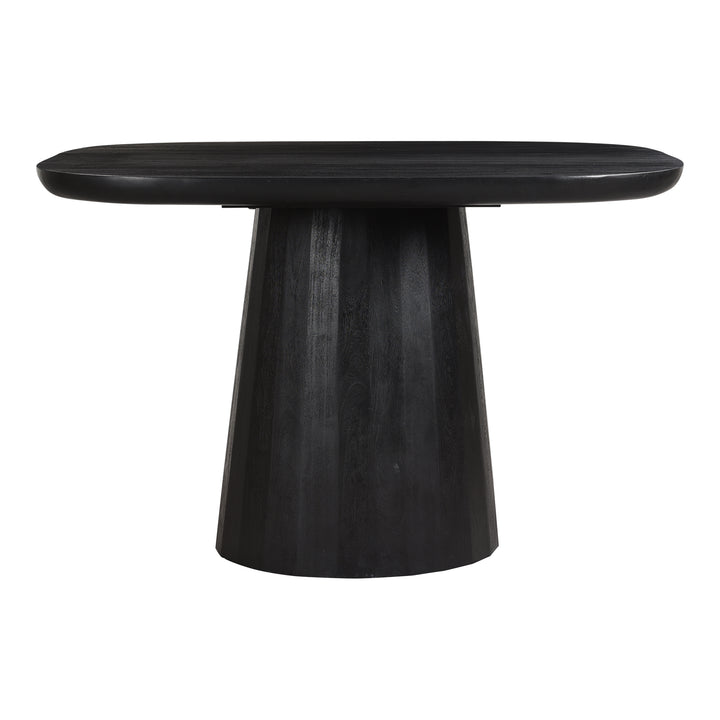 A bold presence in any dining space, the Caelum Dining Table in Black brings rustic elegance with a contemporary twist. Crafted from solid acacia wood and finished in a matte black distressing, its silhouette features an oversized pedestal base and a subtly tapered edge. Rich grain patterns and natural wood markings give each table unique depth and character. Built to seat four comfortably, Caelum merges artisan texture with modern form, creating a table that feels both rooted and refined.