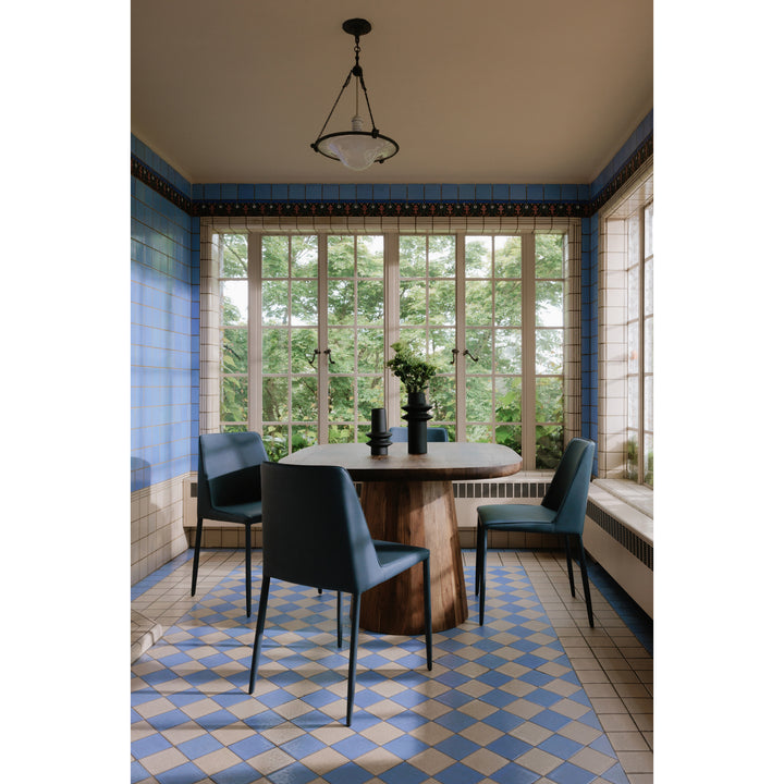 A bold presence in any dining space, the Caelum Dining Table in Black brings rustic elegance with a contemporary twist. Crafted from solid acacia wood and finished in a matte black distressing, its silhouette features an oversized pedestal base and a subtly tapered edge. Rich grain patterns and natural wood markings give each table unique depth and character. Built to seat four comfortably, Caelum merges artisan texture with modern form, creating a table that feels both rooted and refined.