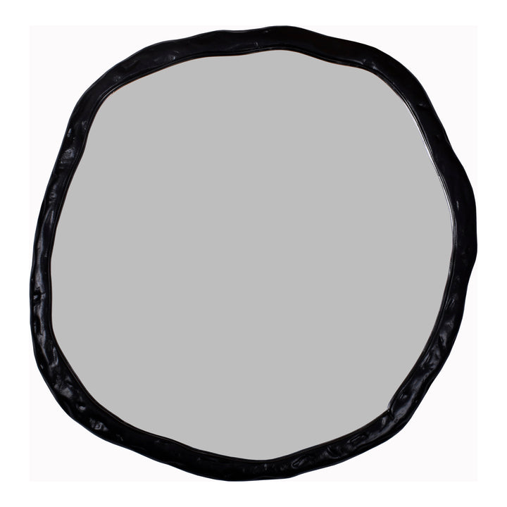 Discover the Calantha Large Black Mirror, a unique blend of art and functionality brought to you by Nadaal Studios. Its warped black frame stands as a testament to modern functionality meeting timeless design, evolving with you and fitting seamlessly into various home spaces.