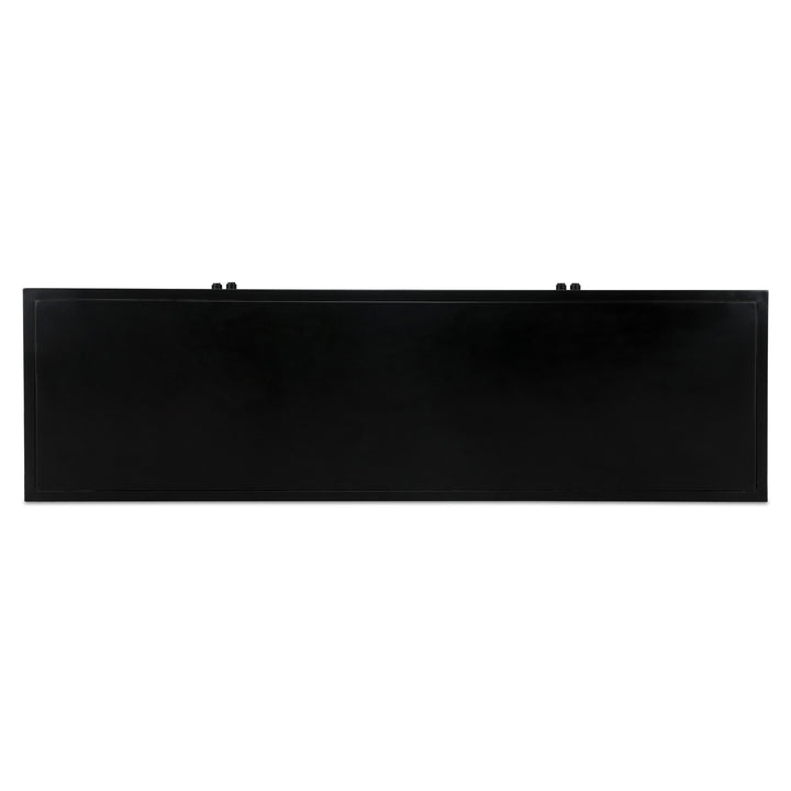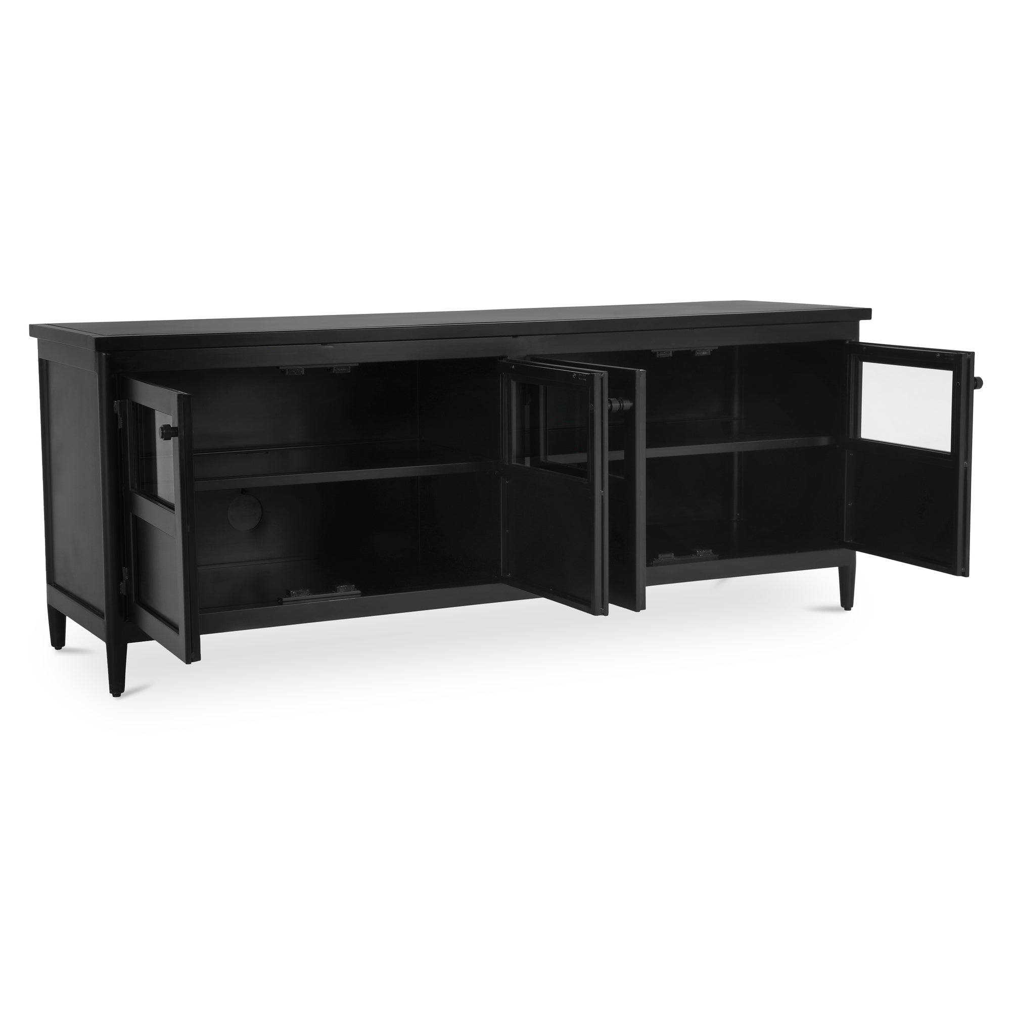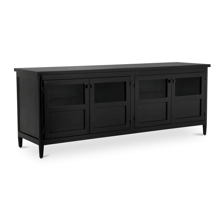 Calen delivers a sleek, modern storage solution for living rooms and media spaces. Crafted in smooth, black powder-coated metal with tempered glass, it balances display and concealment for a clean look. Four half-glass doors frame adjustable shelves for flexible organization, while integrated media holes keep cables tidy and out of sight. Durable metal construction and a simple metal knob detail create a refined, versatile presence that blends easily with contemporary and transitional decor.
