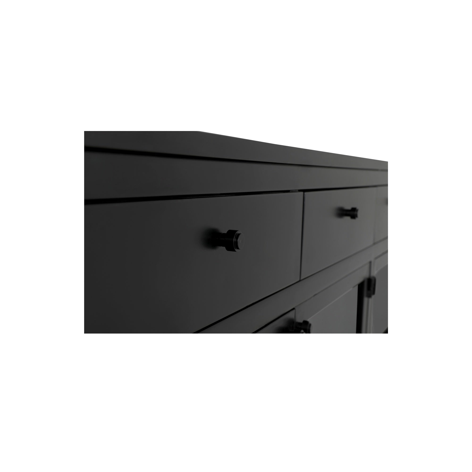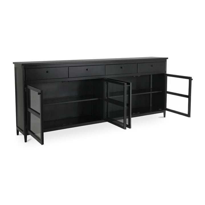 Showcase and store with intention. The Calen sideboard features a black powder-coated iron body with four glass doors and four drawers, offering a balanced mix of display and concealed organization. Tempered glass lends durability and a light visual footprint, while metal hardware completes the streamlined look. With generous interior space and an easy-to-style finish, Calen suits dining rooms and living spaces that favor modern simplicity and everyday function.
