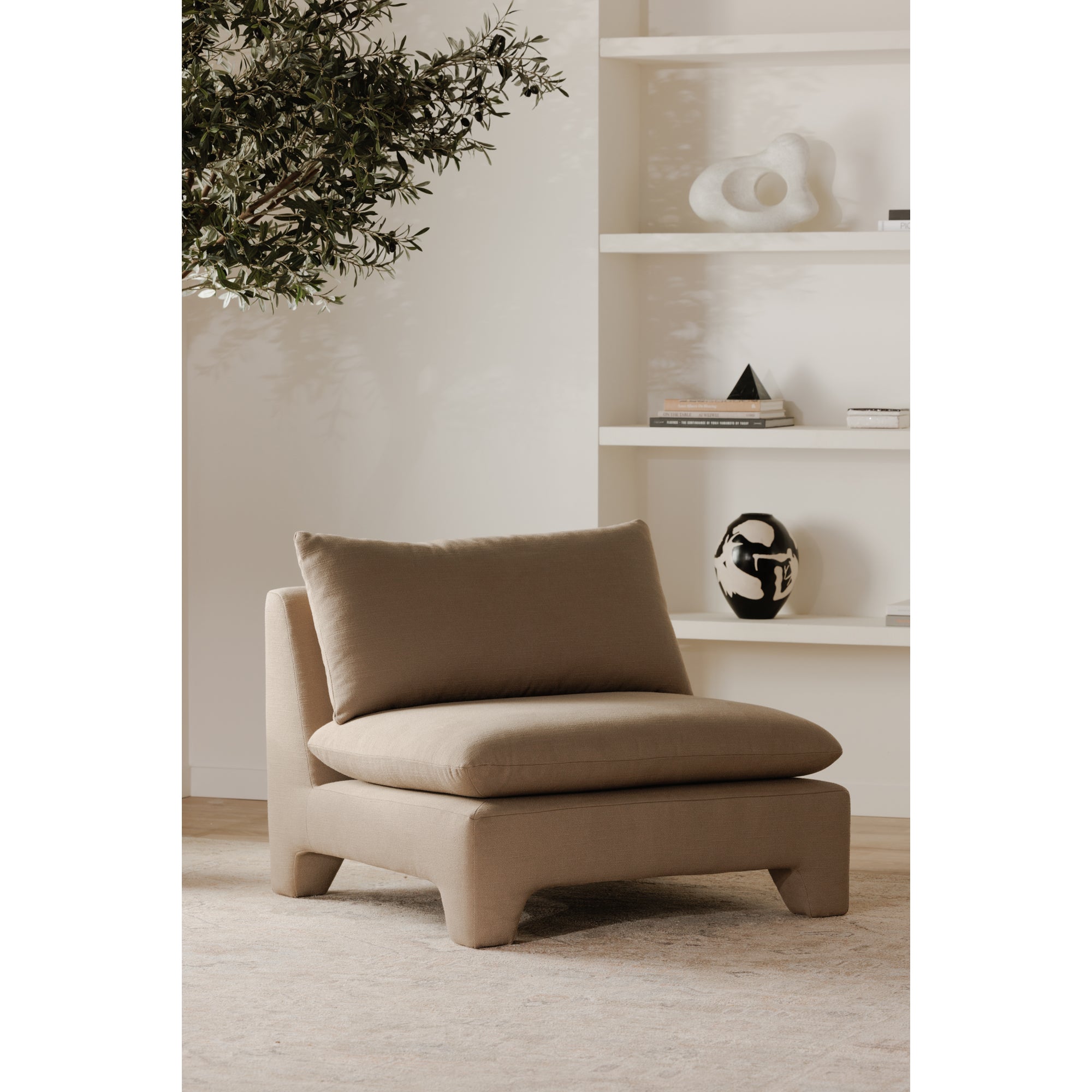 Blending effortless style with unparalleled comfort, the Celeste Lounge Chair from Nadaal Studios is designed for modern living. Featuring an armless silhouette and fully upholstered padded legs, this occasional chair brings a seamless and contemporary touch to any space. Its soft, feather-filled seat is wrapped in a GRS-certified recycled polyester and linen blend fabric, ensuring both sustainability and luxurious comfort. Whether paired with the Celeste sofa or used as a statement piece, this chair offers a perfect balance of relaxation and sophistication.