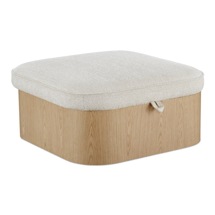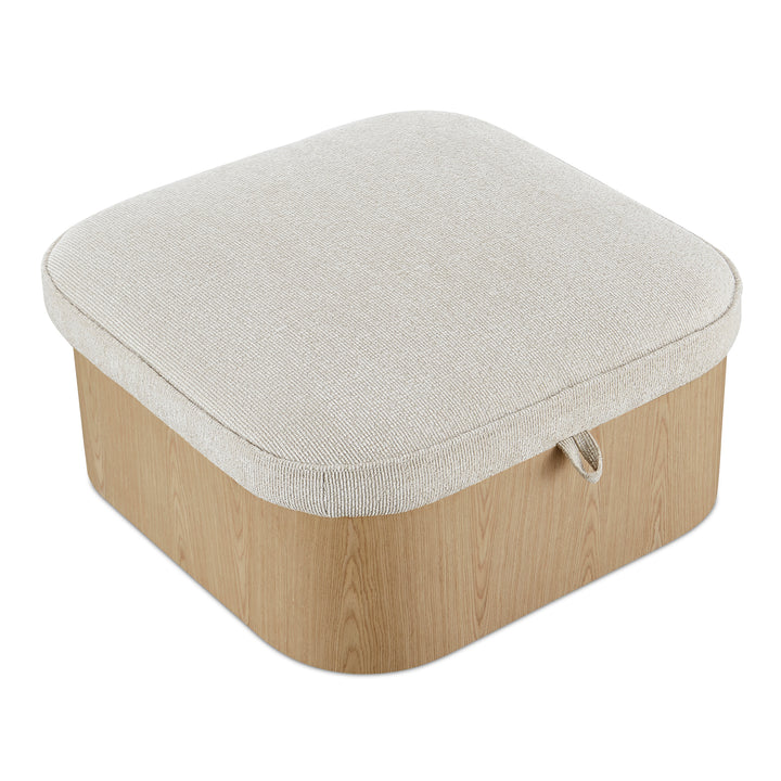 The NADAAL STUDIOS Clarisse Ottoman showcases a harmonious balance of style and functionality. Upholstered in soft flecked oatmeal fabric with elegant piping, the seat provides plush comfort. Its ash veneer base, complete with curved corners, delivers a sleek, minimalist aesthetic. The ottoman features a hydraulic lift top that opens to reveal concealed storage, complete with safety air holes and a pull tab for effortless operation. Fully assembled and ready to use, the Clarisse Ottoman is a sophisticated solution for seating, storage, or enhancing your home décor.