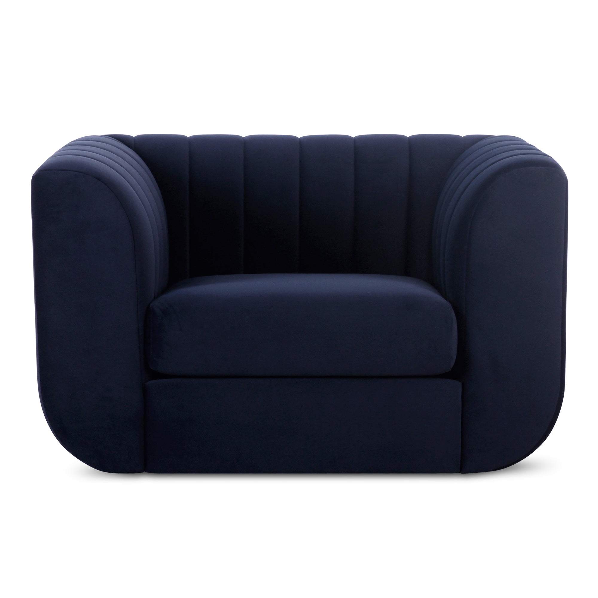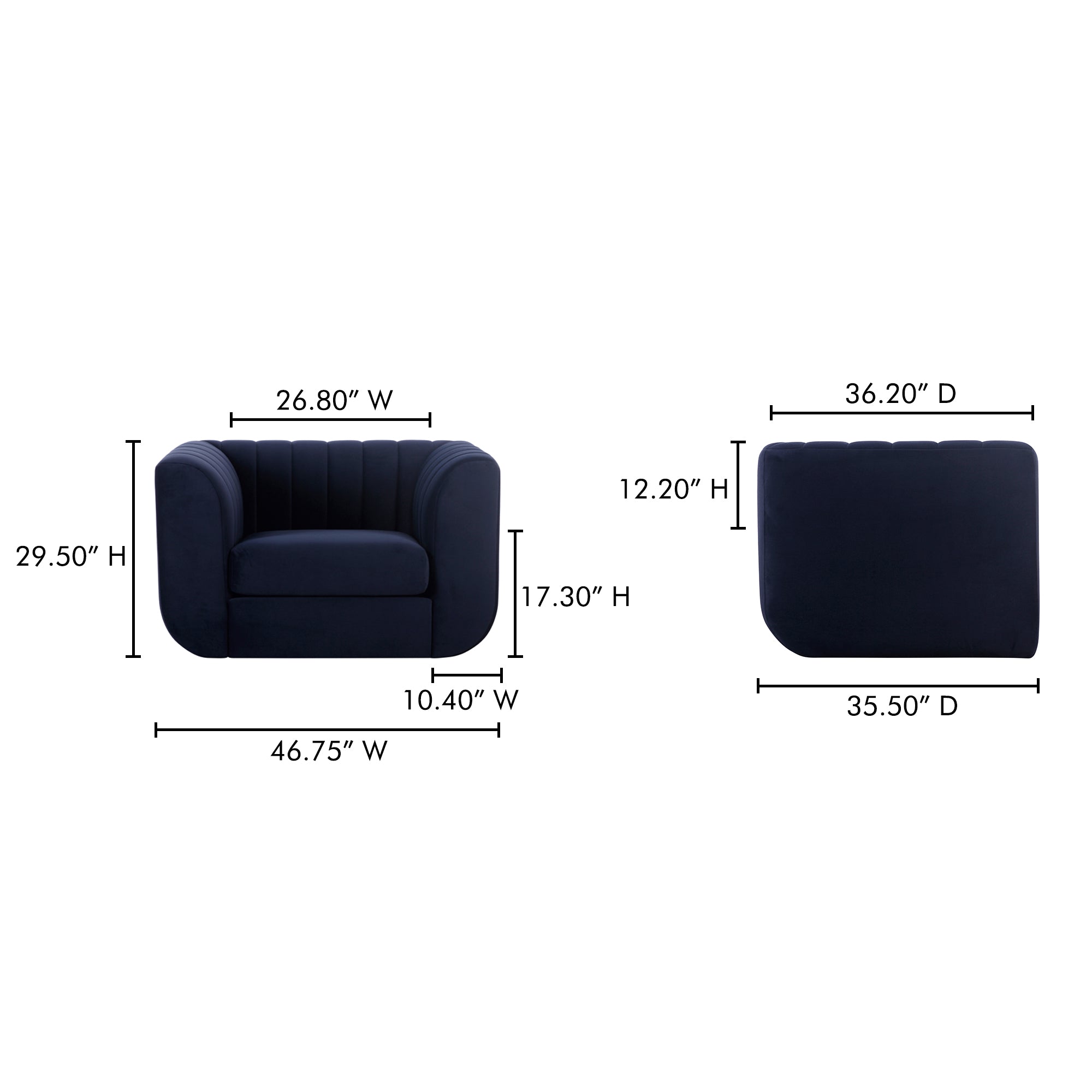 Transform your living space with the NADAAL STUDIOS Corbin Lounge Chair, a perfect blend of contemporary style and Art Deco sophistication. This chair features deep blue 100% polyester upholstery with wide vertical channel detailing, offering a luxurious and modern look. The plywood frame provides sturdy support, while the foam core and polyfill wrapped seat ensure exceptional comfort. The oversized, curved form of the Rosy lounge chair adds a touch of elegance to any room. With removable cushions for easy cleaning, this chair is both stylish and practical, making it a standout addition to your home decor.