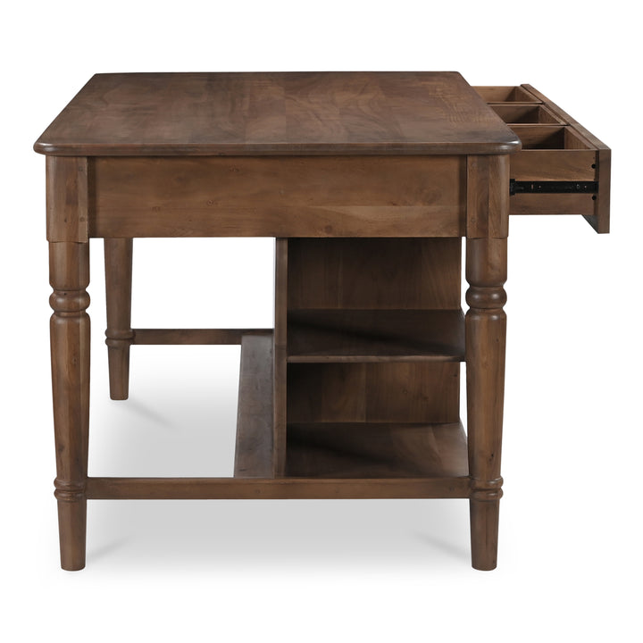 The Cove Counter Table in Brown brings both charm and function to kitchen or dining spaces with its traditional detailing and ample storage. Crafted from solid acacia wood with matching acacia veneer, this kitchen island features turned legs, an overhanging tabletop, and intricately carved accents that nod to classic furniture-making. Three drawers and six open shelves provide organization for cookware, serveware, or decor, while a built-in footrest and side towel bar add thoughtful practicality. With its mid-tone brown finish and multipurpose structure, Cove brings warmth and function to casual dining, prepping, or gathering.