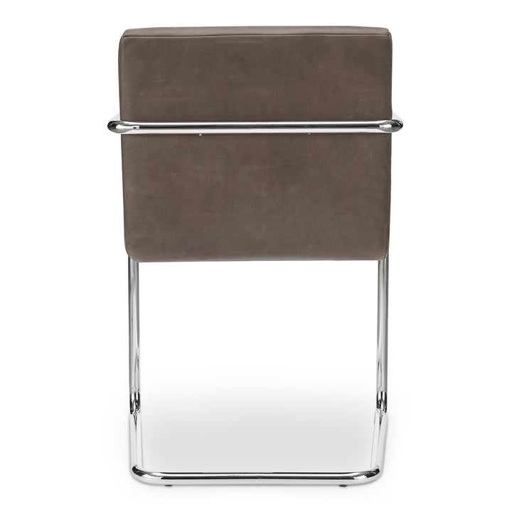 The Cyran dining chair blends sculptural ease with rich tactility. Its cantilever stainless steel frame creates an airy, modern posture, contrasted by channeled top-grain leather cushioning in warm brown. Aniline-dyed leather develops a lived-in character over time, softening and gaining a natural patina. With supportive foam and a stable plywood core, Cyran delivers comfort and longevity. Pair it with wood, stone, or metal tables for a refined, timeless dining statement that evolves beautifully.