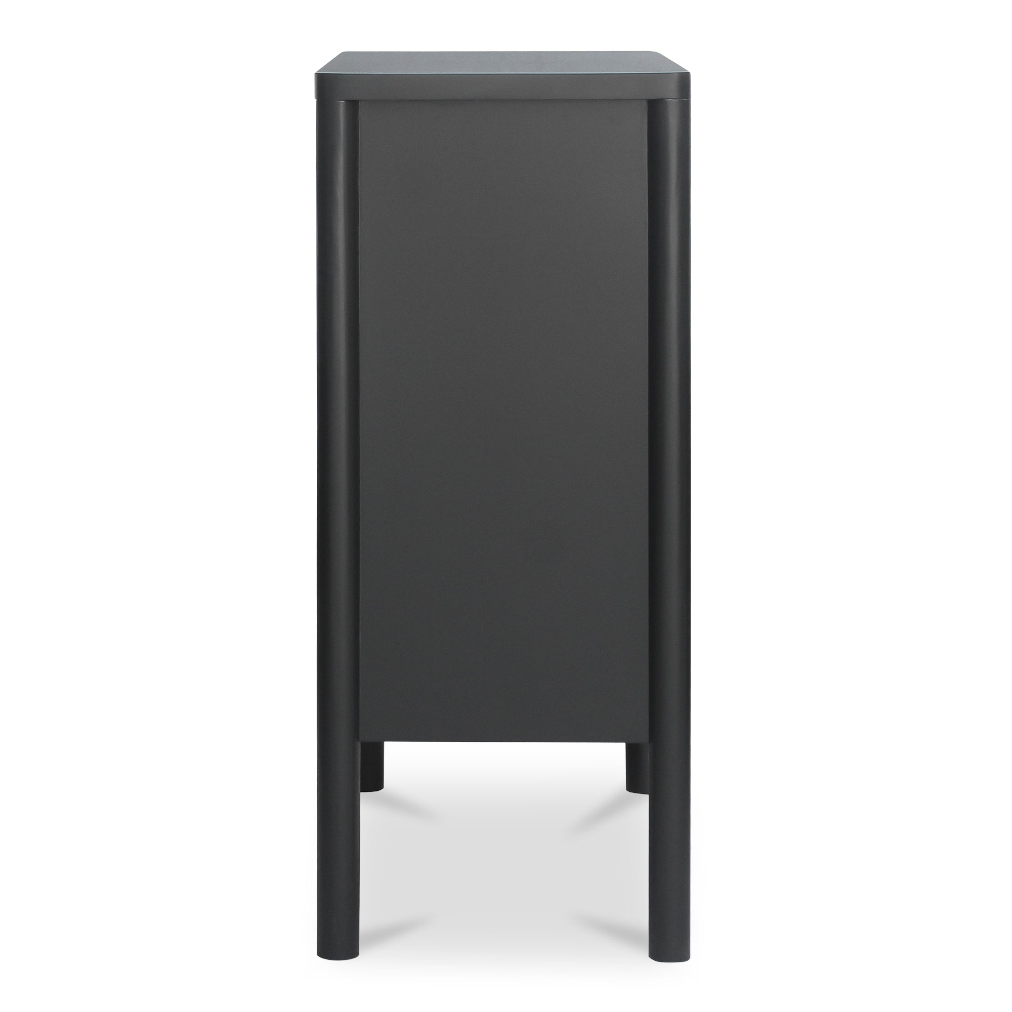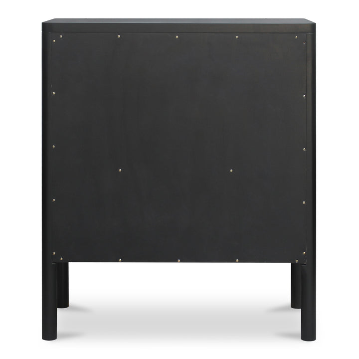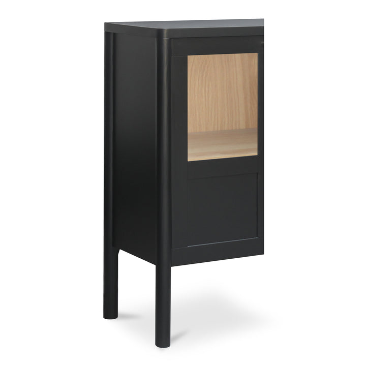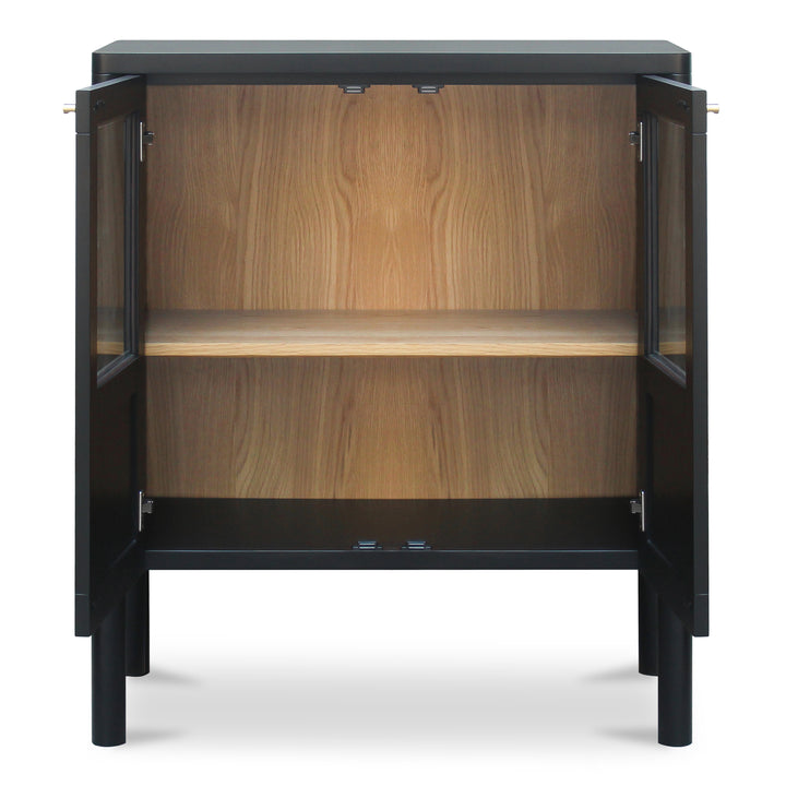 Delmira brings the elegance of classic millwork to a modern cabinet. A solid pine frame rests on dowel legs, while tempered glass panels balance display with concealed storage for a tidy, composed look. Oak veneer interior elements add warmth, and simple bronze-toned hardware completes the refined profile. Ideal in dining rooms, living spaces, or entryways, this black cabinet offers versatile organization without visual clutter—quiet craftsmanship designed to evolve with your space and daily routine.