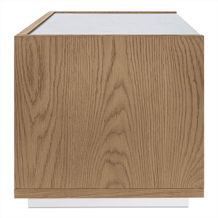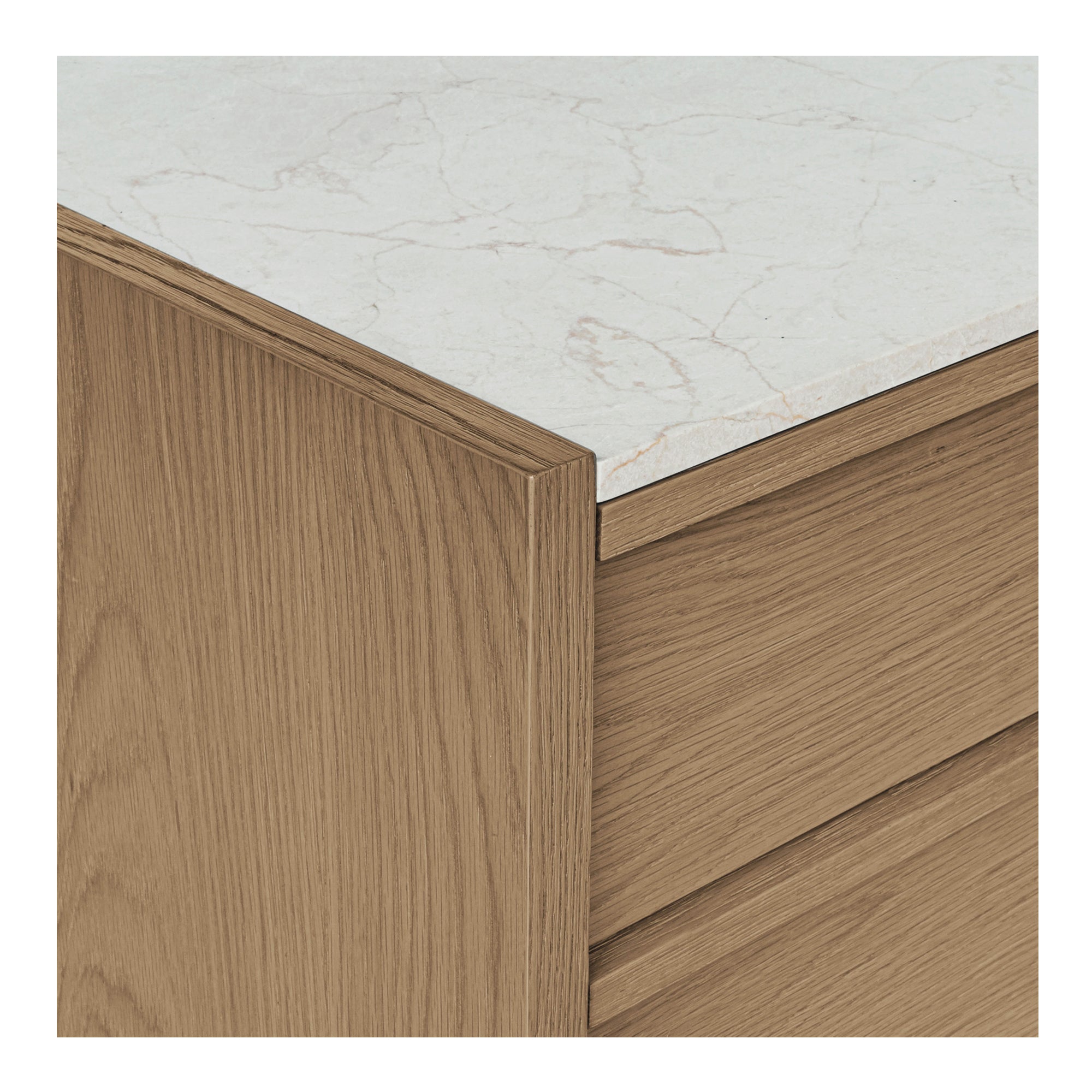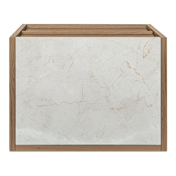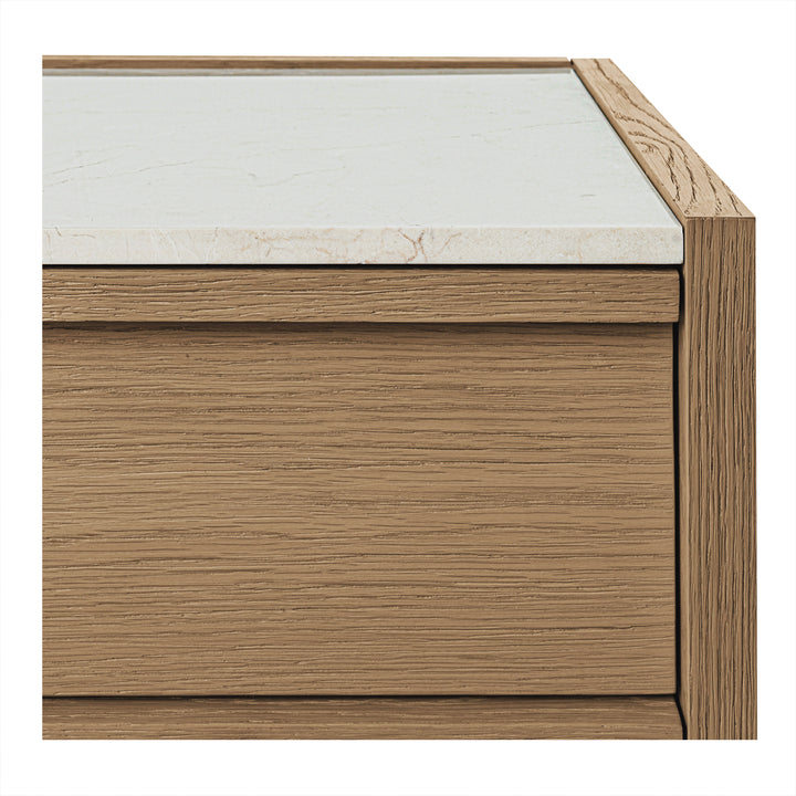 Delmira’s balance of luxury and natural form brings quiet sophistication to bedside storage. A light rosa marble top rests upon a solid oak frame and veneered body, showcasing warm grain and gentle contrast. Two soft-close drawers offer ample storage, while a slender metal base adds architectural lift. Each marble surface varies in veining, ensuring one-of-a-kind beauty. The result—an elevated nightstand that bridges utility, elegance, and timeless craftsmanship.
