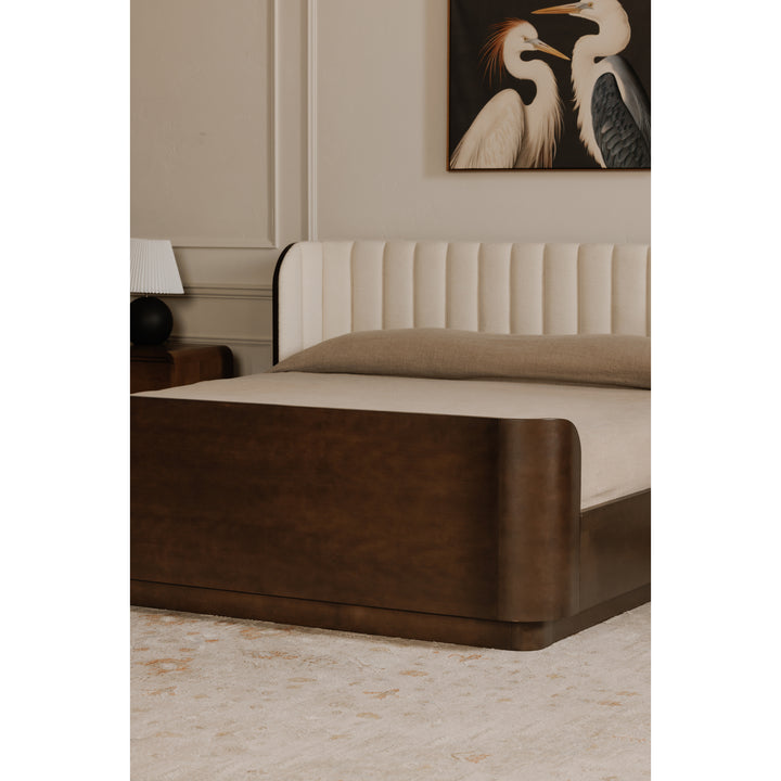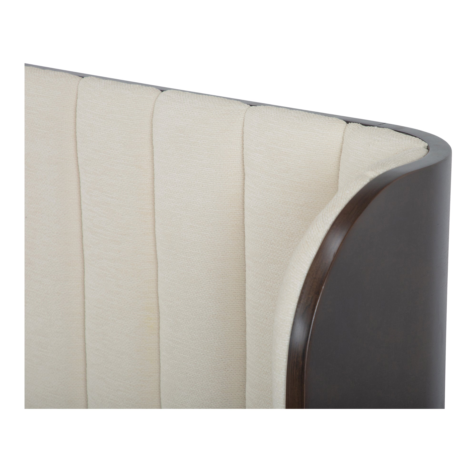 Timeless form meets contemporary texture in the Elric Bed from Nadaal Studios. Upholstered in a soft cream 100% polyester fabric, the gently curved sleigh-style headboard offers a wraparound effect—inviting you to unwind, read, or simply rest in understated luxury. The frame is finished in a dark birch veneer over durable MDF, while a warm rubber wood base brings natural grounding to its graceful silhouette. Supportive slats are included for added structure—no box spring necessary. Elric creates a cozy focal point for the bedroom with design that never goes out of style.