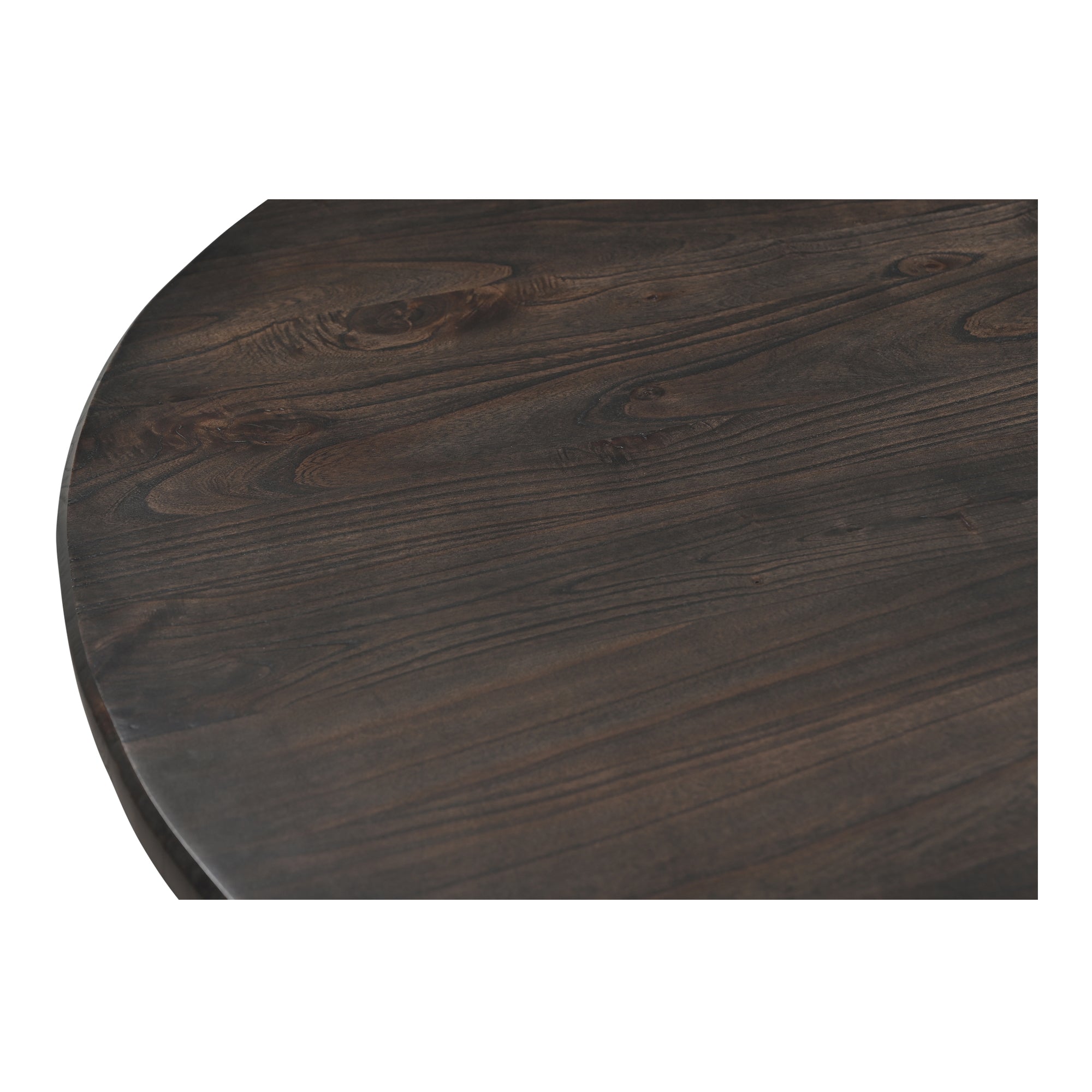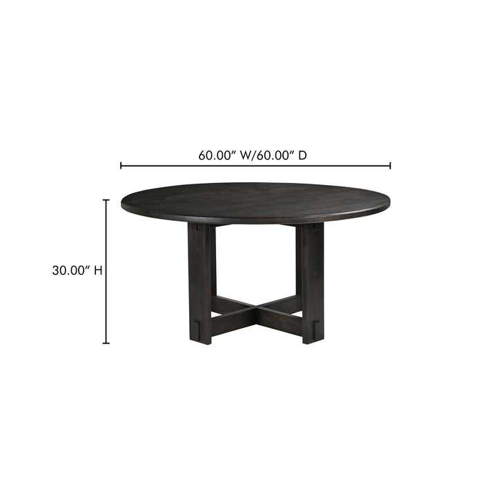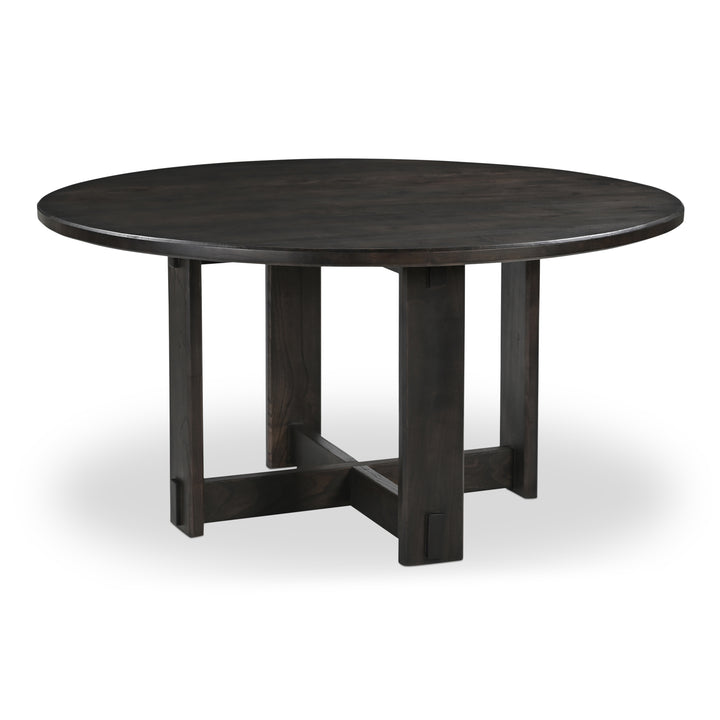 Fiorenza Dining Table for 6, Round Top, Solid Neem Wood, Joinery Detail, Iron Accents, Dark Brown