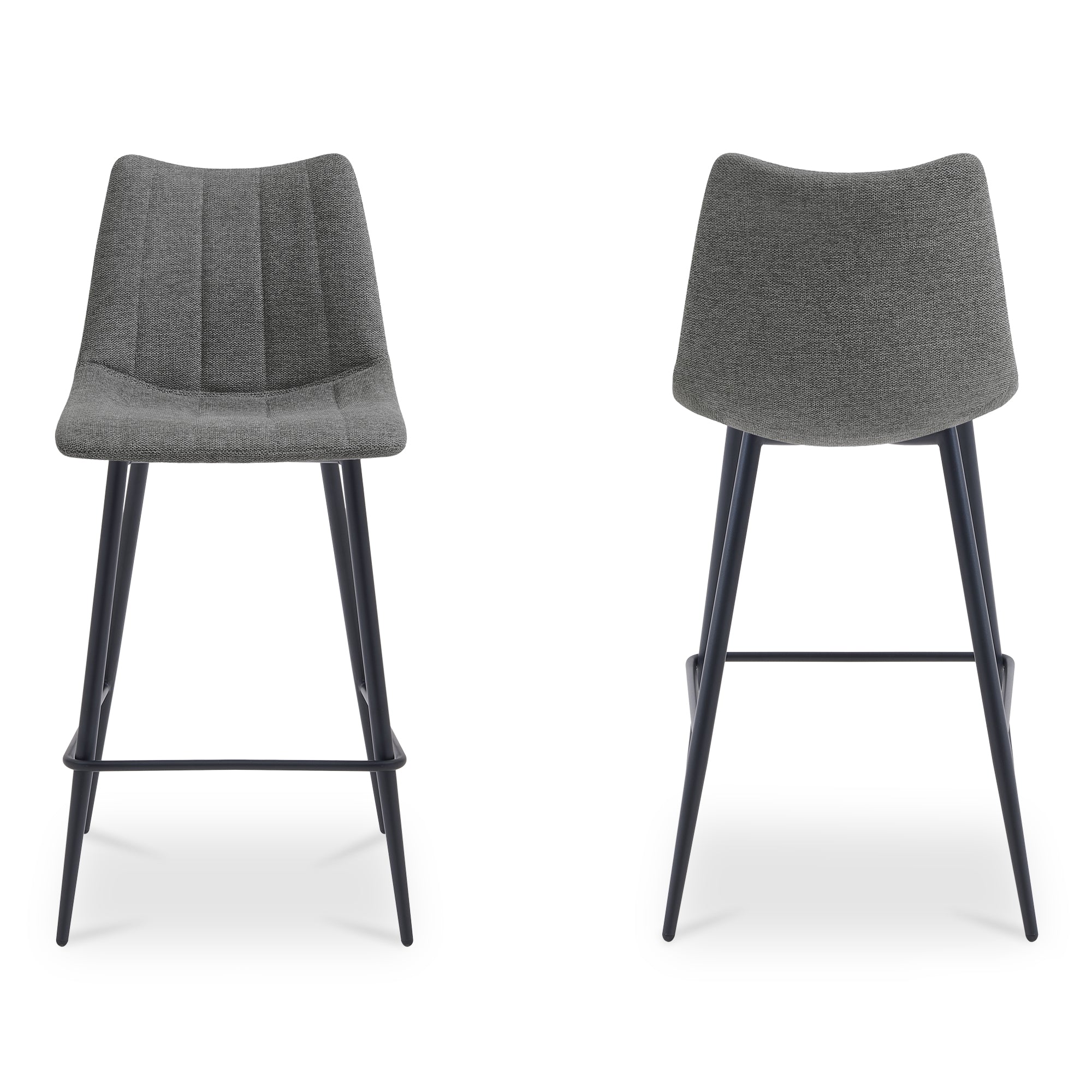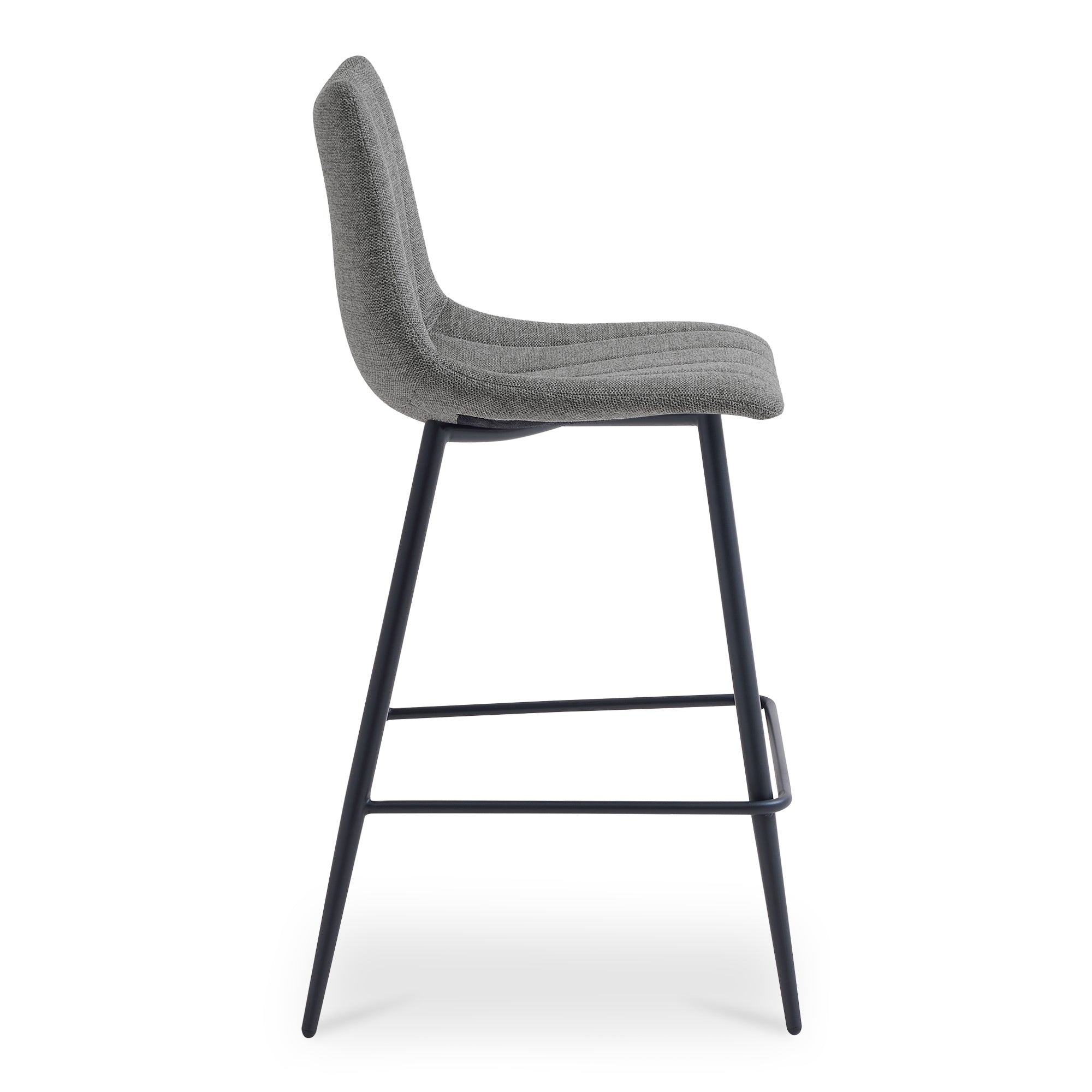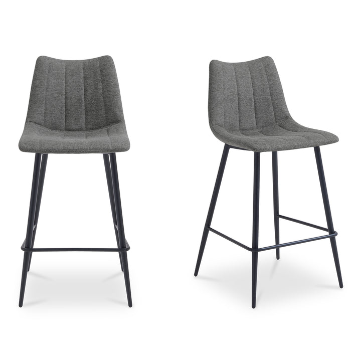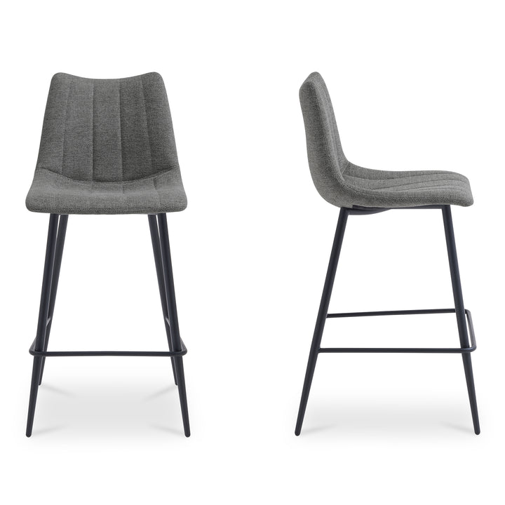 Florian brings sculpted comfort to the counter. A curved, supportive seat in dark grey performance fabric offers a tailored look that stands up to daily use. Slim tapered iron legs keep the silhouette light while providing dependable stability. Refined stitching and balanced proportions make it an easy fit for kitchens and islands, blending modern ease with materials designed for everyday life and a clean, composed presence from every angle.