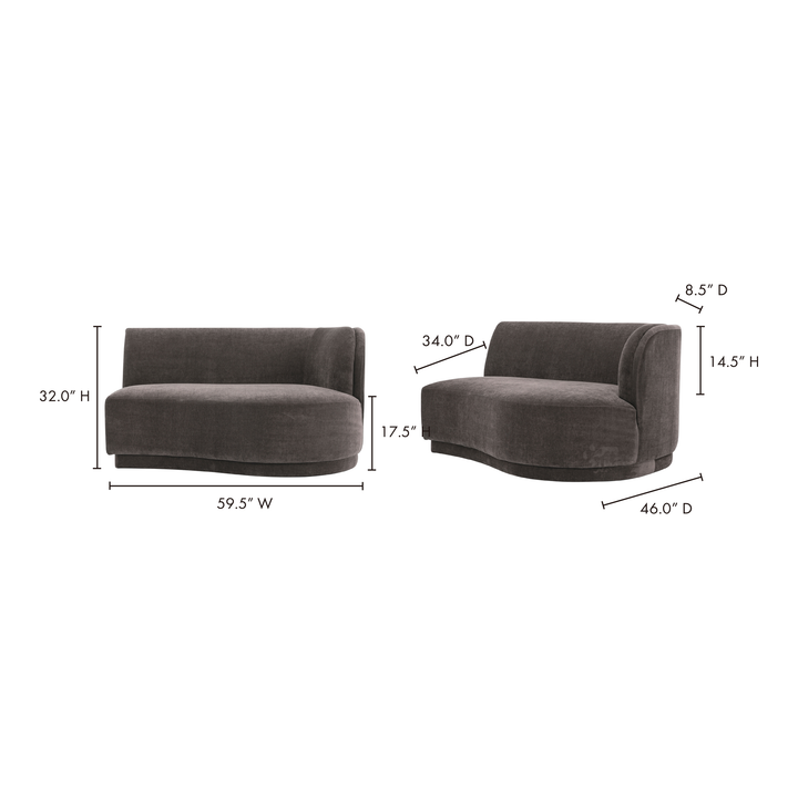 Grant, Mid-Century Right Chaise, 2 Seater, Velvety Grey Polyester Upholstery