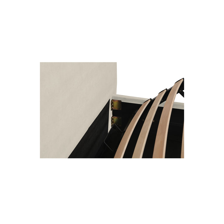 The Jalenor Storage Bed blends soft architectural curves with refined detailing through its gradual arch headboard, rounded footboard, and tonal twisted trim. Upholstered in smooth cream polyester, it creates a cohesive, calming palette suitable for modern bedrooms. Supported by solid wood, plywood, and MDF, the frame ensures long-lasting stability, while the hydraulic lift system reveals spacious under-bed storage that keeps essentials organized without interrupting the bed’s sculptural appeal.