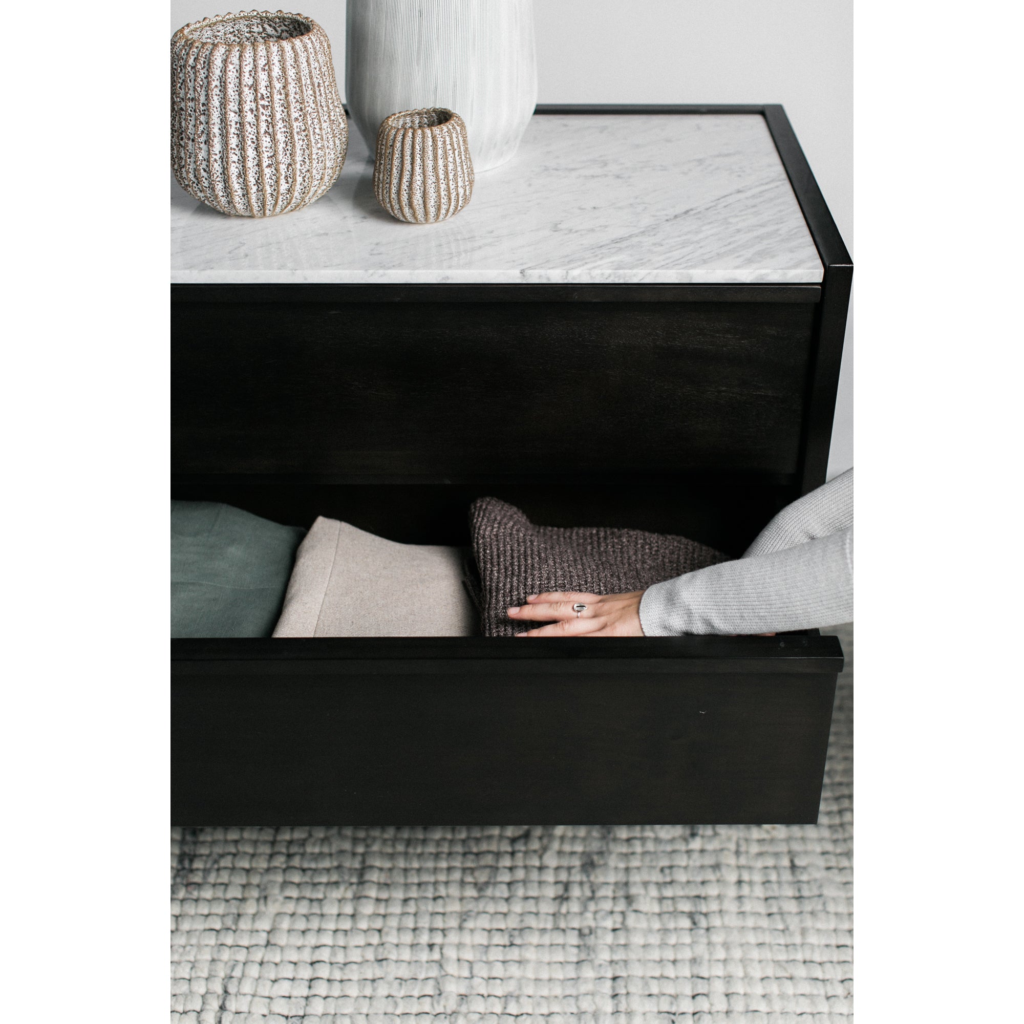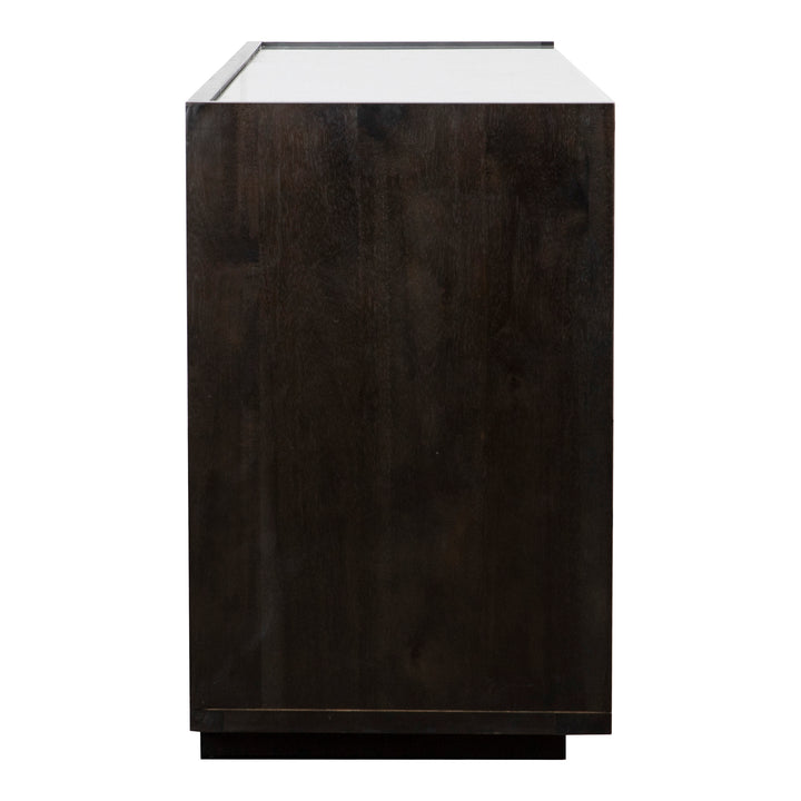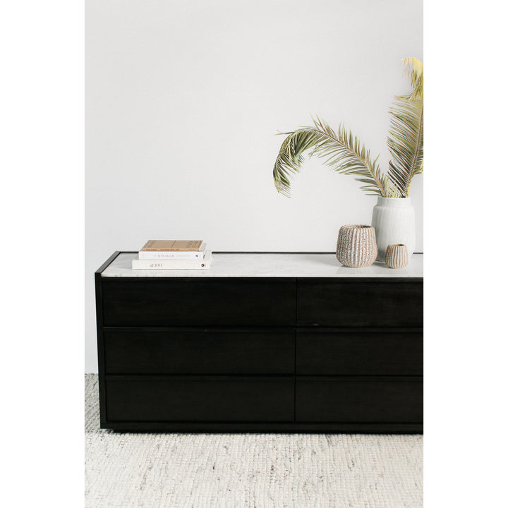 Elevate your bedroom decor with the luxurious Jordan Dresser from NADAAL STUDIOS. This contemporary dresser features an acacia wood construction with a dark grey finish, complemented by a stunning white marble top. The use of natural materials embraces imperfections, such as unique marble veining and woodgrains, making each piece truly one-of-a-kind. The Jordan Dresser includes six drawers with side-mounted glides for smooth operation, providing ample storage for your clothing and accessories. Wooden drawer-pulls add a touch of elegance to the design. Some assembly is required. The Jordan Dresser combines style, functionality, and quality craftsmanship, making it a perfect addition to any modern bedroom.
