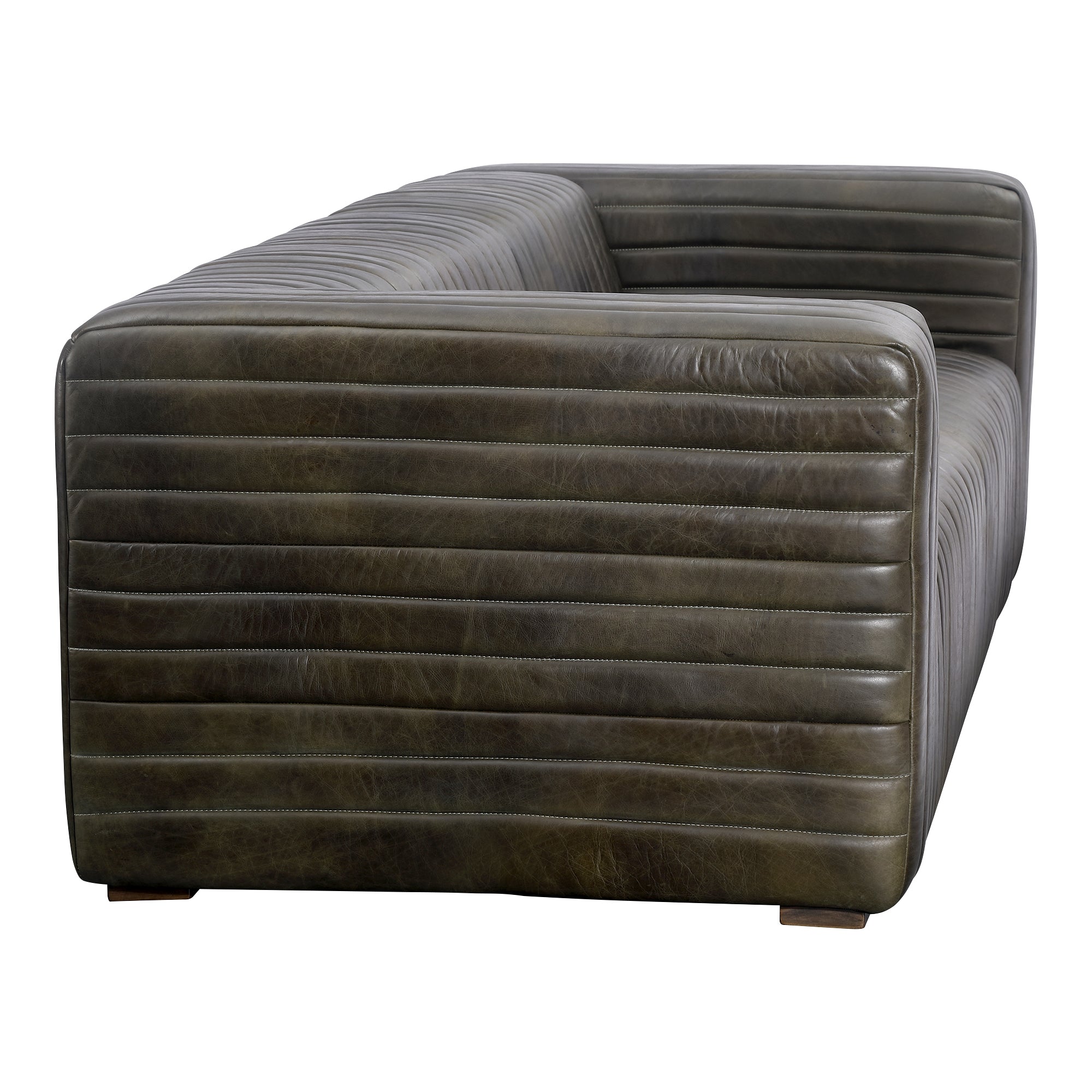 The Kennedy Sofa by Nadaal Studios is the epitome of industrial luxury, offering a perfect balance of style and comfort. Upholstered in premium top-grain cowhide leather, this sofa features a striking channel-stitched design that adds texture and depth to its sleek profile. The sturdy plywood frame, combined with foam and spring support cushioning, ensures long-lasting comfort and durability. The sofa sits firmly on blocked, solid rubber wood feet, equipped with protective leg glides to prevent floor damage. With its rich charred olive color and industrial aesthetic, the Kennedy Sofa is an ideal centerpiece for any living room, den, or office, providing ample seating for three.