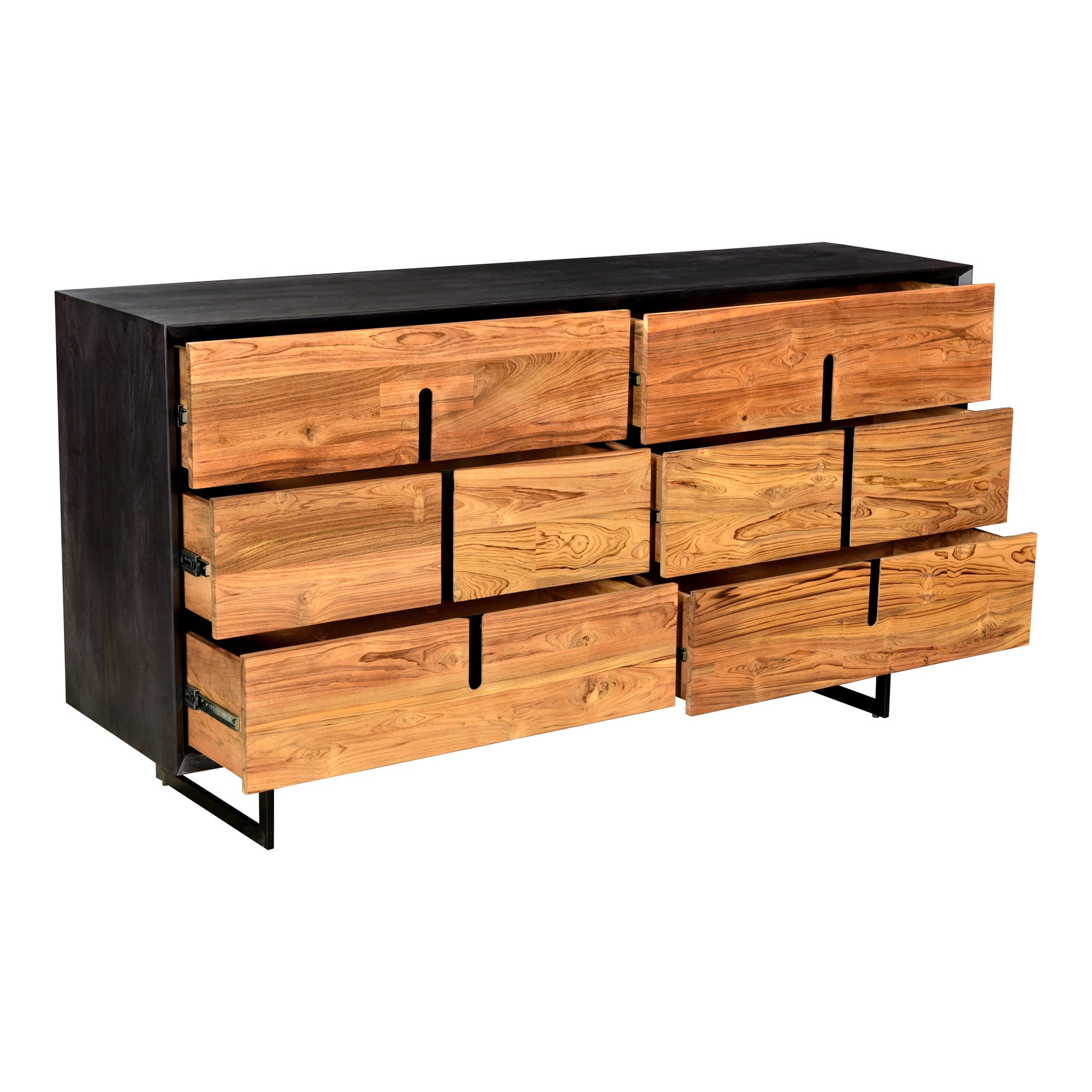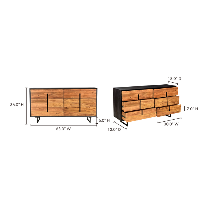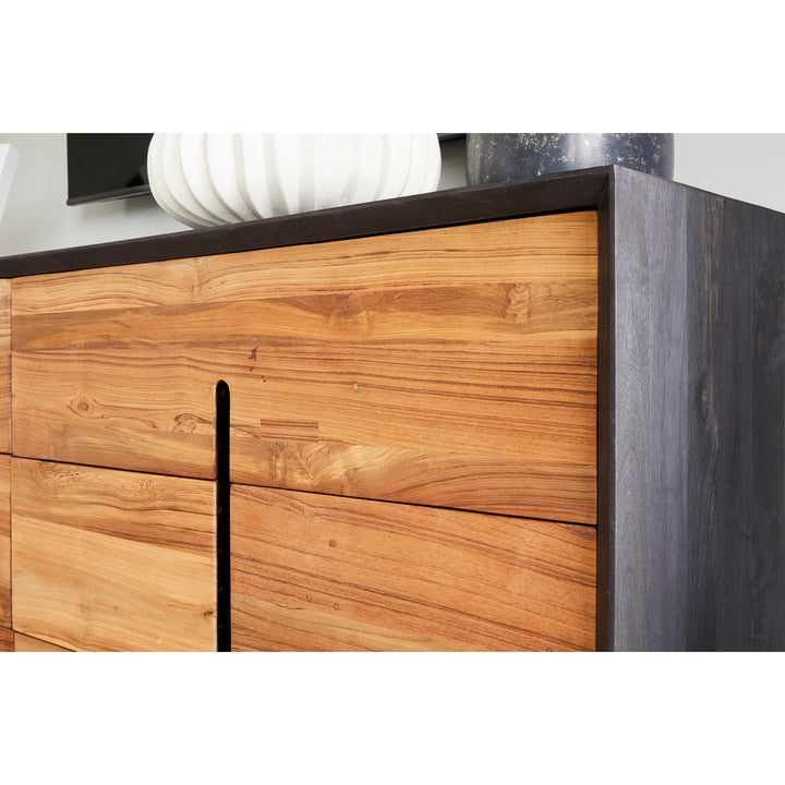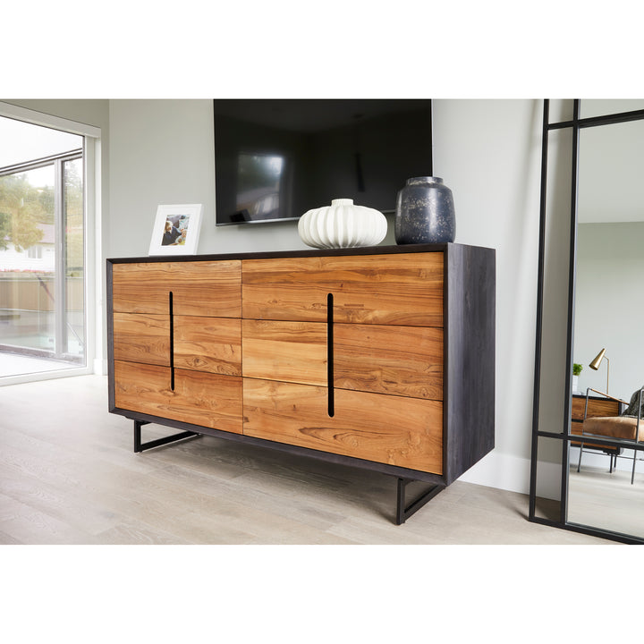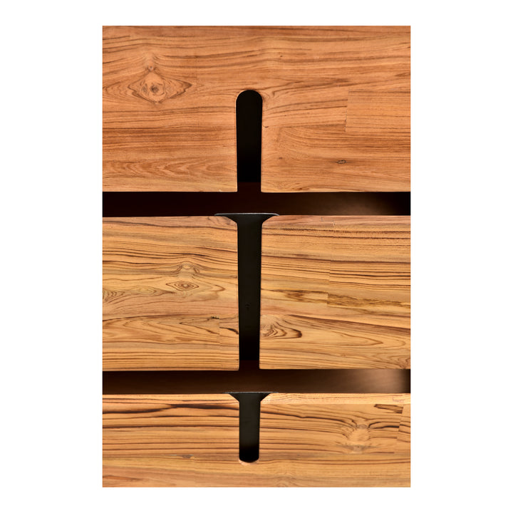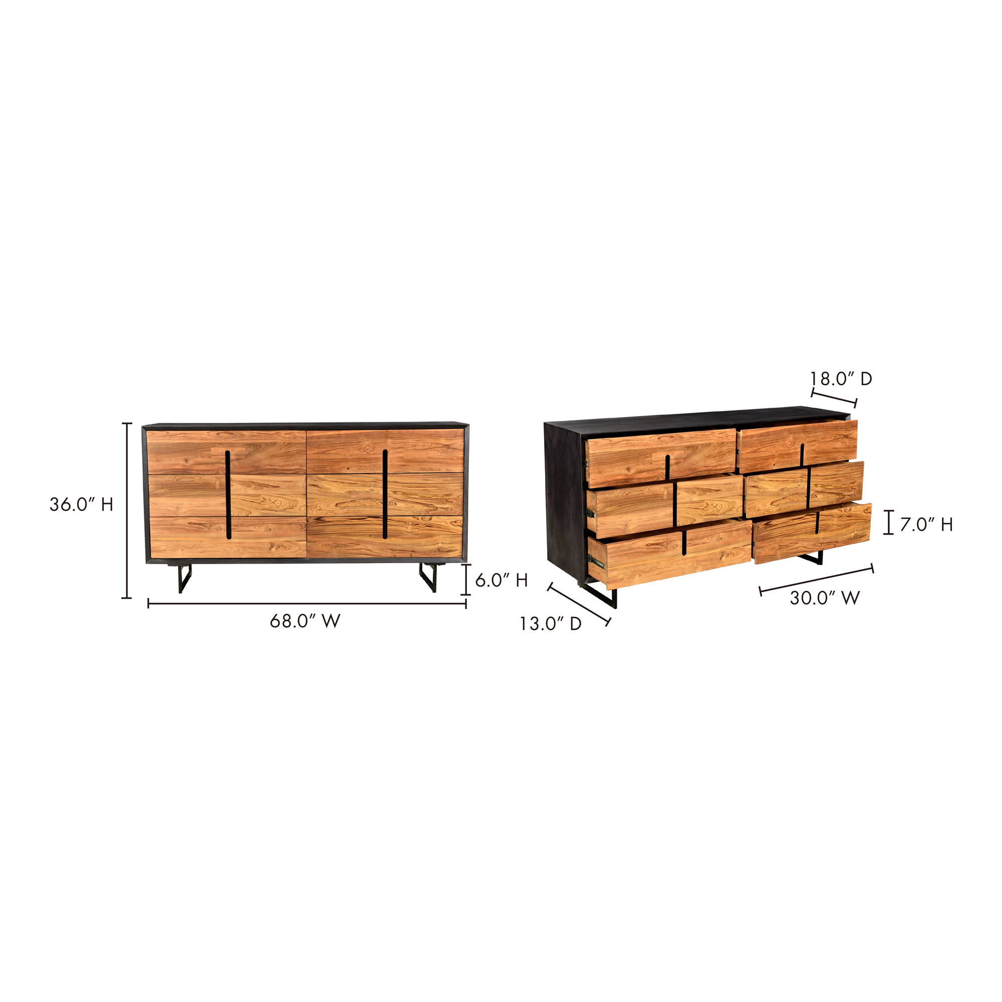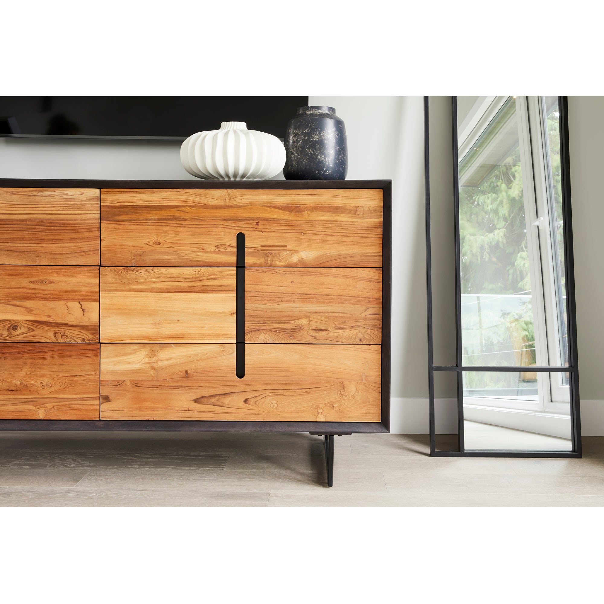 Introduce Scandinavian elegance to your home with the Lennox Dresser from NADAAL STUDIOS. This beautifully crafted dresser features a solid mango wood frame and six reclaimed teak drawer fronts, providing a unique and natural look. The slim, streamlined powder-coated metal legs add a modern touch, enhancing its Scandinavian design. The Lennox Dresser includes six spacious drawers with side mount ball bearing glides, offering ample storage for your clothing and essentials. Some assembly is required. The combination of high-quality materials and stylish design makes the Lennox Dresser a perfect addition to any bedroom or living space.