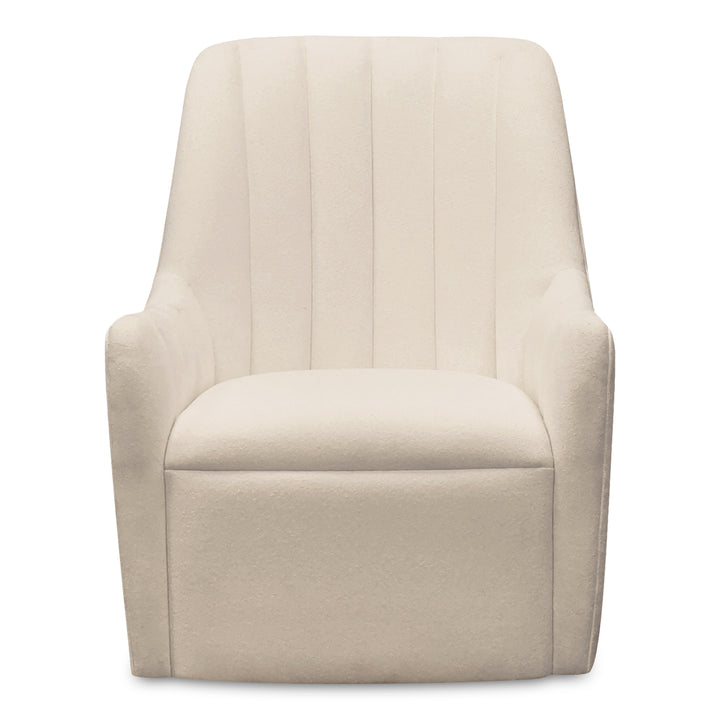 Enhance your space with the Linden Swivel Chair from Nadaal Studios, upholstered in soft, durable Performance Treatment fabric in a fresh white tone. This chair features a high-back design with elegant channel detailing, providing both comfort and style. With its 360° swivel function, it offers flexibility in any room, making it perfect for living rooms, reading nooks, or home offices. Built on a sturdy rubber wood and plywood frame and padded with foam and fiber for added support, the Linden Swivel Chair is an ideal choice for those seeking a blend of function and elegance.