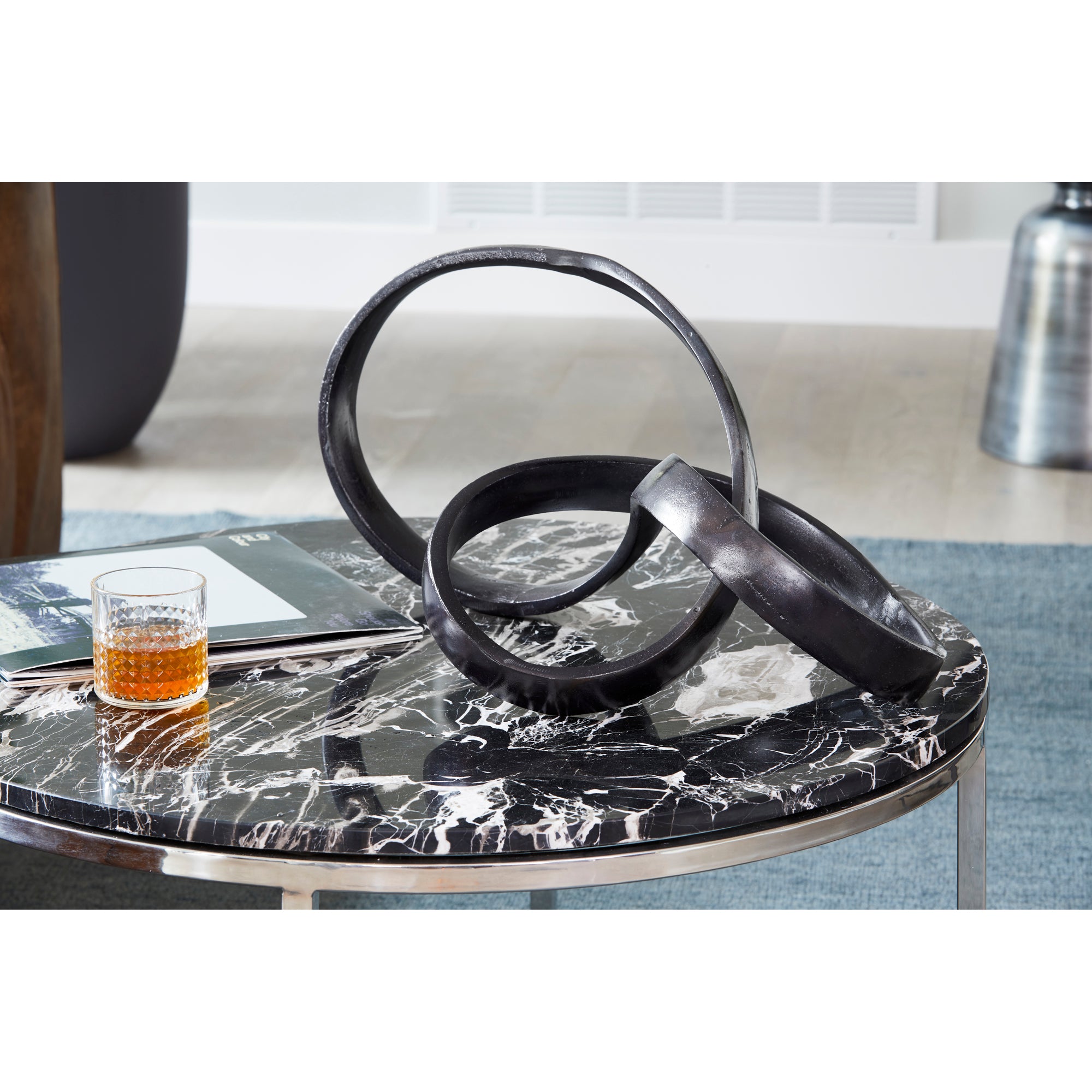 Introducing the Lysandra Sculpture from Nadaal Studios, where modern functionality fuses with timeless artistry. This exquisite piece, crafted in India, is a testament to our ethos: to inspire and transform living spaces with designs that evolve with you. Cast in lightweight aluminum and finished in a cool, black cobalt hue, Lysandra is more than a sculpture-it's a symbol of perpetual beauty in contemporary form. Its unique 3-dimensional infinity design is a conversation starter, adding a touch of sophistication to your home. With no assembly required and a one-year warranty, this piece is not just an artistic statement, but a commitment to lasting quality and style.
