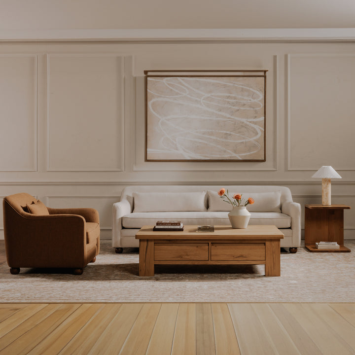 Inspired by traditional trunks but built for modern homes, the Mareth Coffee Table from NADAAL STUDIOS blends nostalgic design with contemporary finishes. Its thick oak veneer top with gently rounded edges sits atop a solid oak base with clean-lined post legs. Two drawers, accessible from either side, add discreet functionality while maintaining a minimalist silhouette. It's a grounded centerpiece that blends structure, storage, and style.