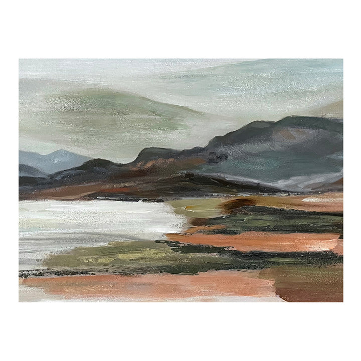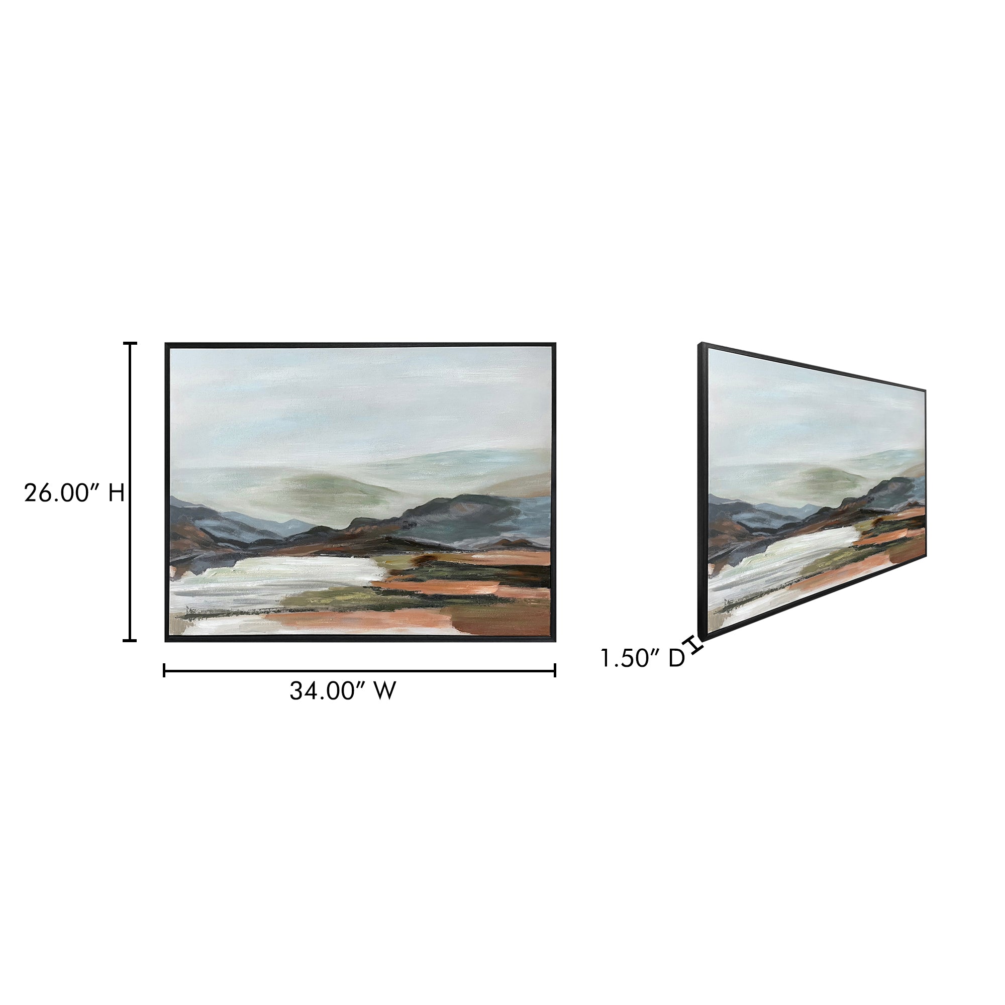 Evoking a serene and expansive horizon, the Mariselle Framed Painting blends color and texture into a tranquil, rustic landscape. Soft peaks in cool blues and greys meet warm-toned plains below, all brought to life through layered, textured brushstrokes. This piece is rendered on canvas and mounted on a pine wood stretcher, then framed in solid pine with a matte black finish. Its dimensional paint adds depth, while the rustic palette makes it easy to integrate into both classic and modern spaces. Hanging hardware is included for simple, secure display.