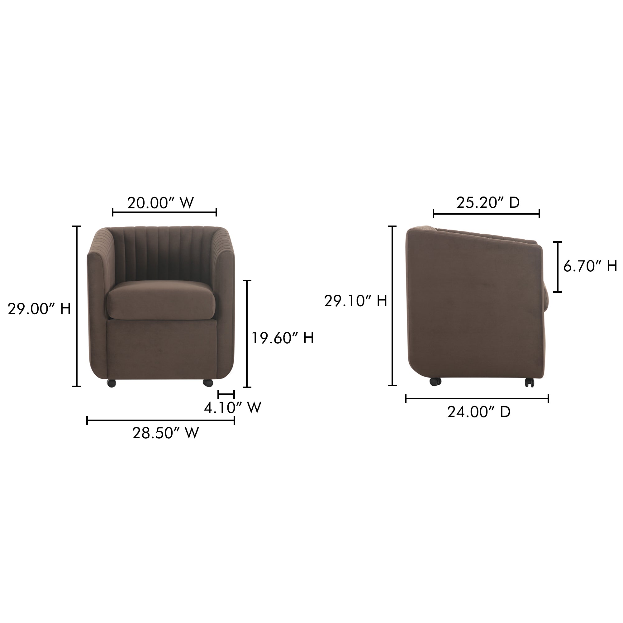 Mehta Rolling Dining Chair, Contemporary Velvet with Channel Detailing, Brown