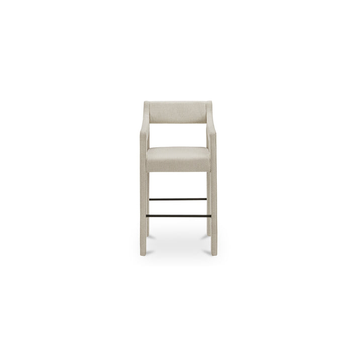 The Merel Counter Stool brings playful pattern and sculptural refinement through its striped performance fabric, sloped armrests, and continuous frame. Piped detailing outlines its silhouette for added definition, while the iron frame and stretchers provide dependable support. Designed to mix texture, shape, and color, this stool elevates counter seating with personality and comfort.