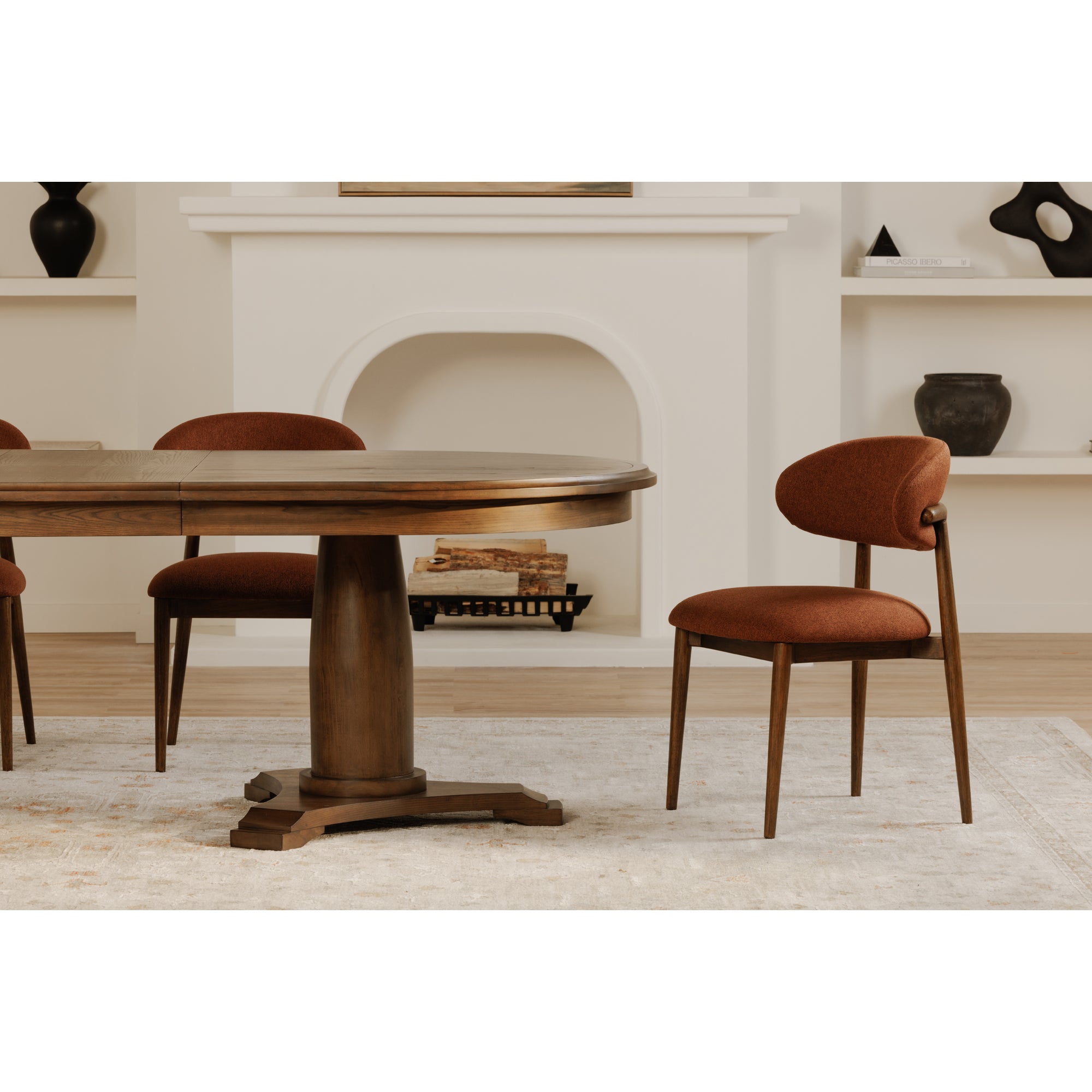 The Merrick Dining Table by Nadaal Studios combines rustic charm with modern functionality. Featuring an ash veneer over an MDF tabletop and bottom leg with a matte vintage brown wood finish, this table brings warmth and versatility to your dining space. The rubberwood edge and legs add stability and a natural look. Its butterfly extension mechanism allows the table to extend from 76 inches to 94 inches, seating up to 10 people comfortably. Ideal for both everyday use and larger gatherings, this dining table adapts to your needs with ease while adding a refined, rustic touch to your home.