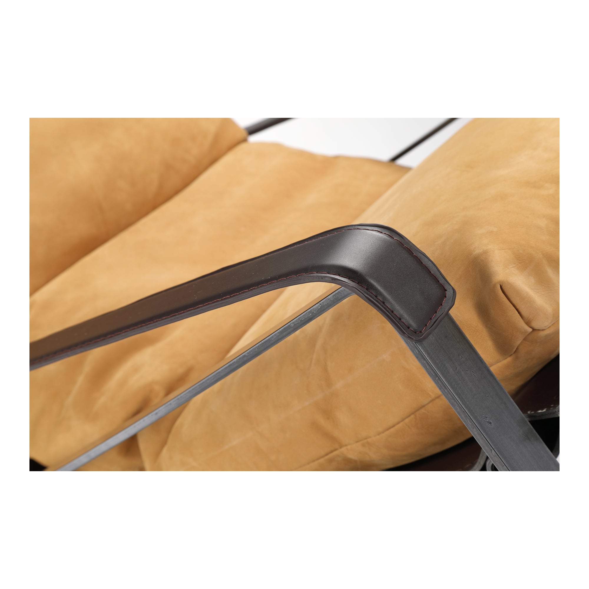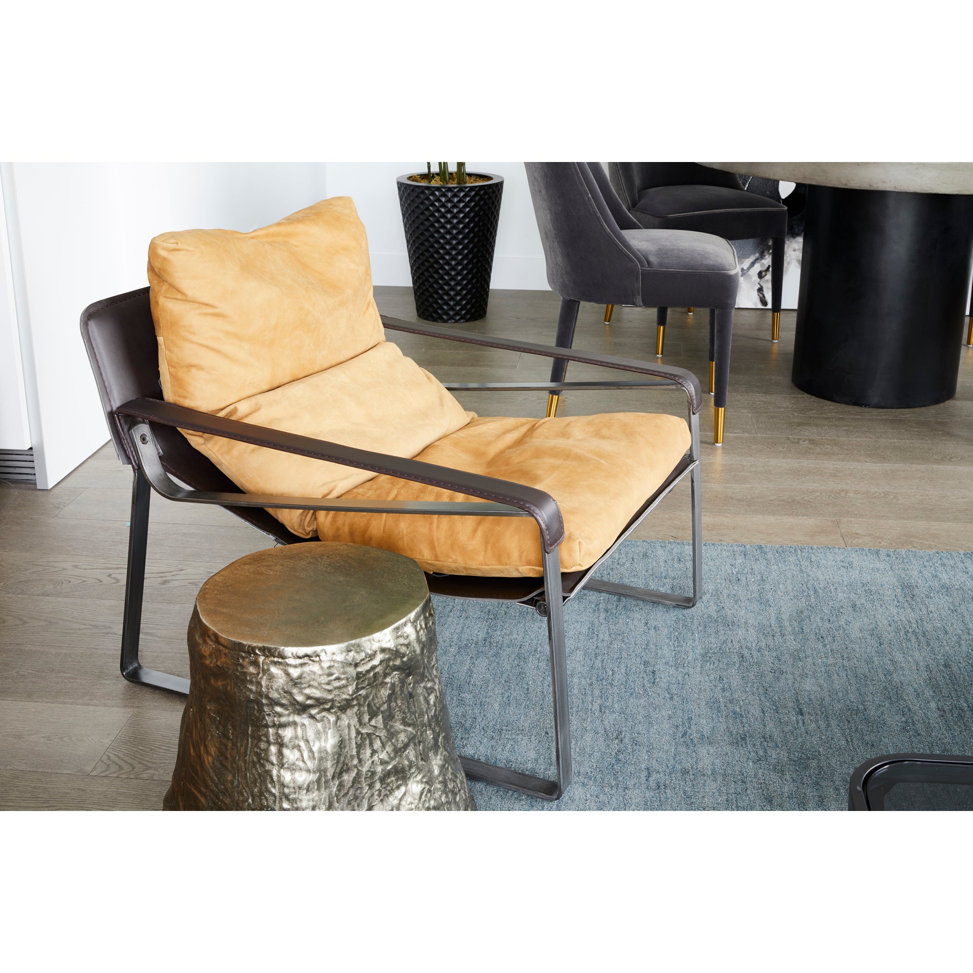 Introducing the NADAAL STUDIOS Newton Accent Chair, a contemporary modern piece that combines luxurious top-grain leather with a sleek iron frame. This chair features a reclined sling seat upholstered in high-quality tan leather, offering both durability and a sophisticated appearance. The bonded leather cushion support filled with foam and feathers ensures a comfortable seating experience, perfect for any modern living space. The sturdy iron frame provides stability, while the leather-wrapped armrests add an extra touch of elegance. With no assembly required, this chair is ready to enhance your decor right away, making it a convenient and stylish addition to your home.