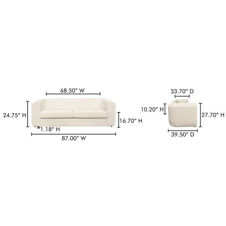 The Orion Sofa from Nadaal Studios is the epitome of modern elegance, featuring a sophisticated white C0 Performance Treatment fabric that’s designed to last. With beautifully crafted double-edge detailing, a gently curved back, and invitingly rounded arms, this sofa adds charm to any living room. Its sturdy frame, made from rubber wood and plywood, provides lasting durability, while the foam and fiber cushions ensure a soft, supportive seating experience. Removable cushions make cleaning easy, making this piece as functional as it is stylish. The Orion Sofa is the perfect centerpiece to create a serene, contemporary living space.