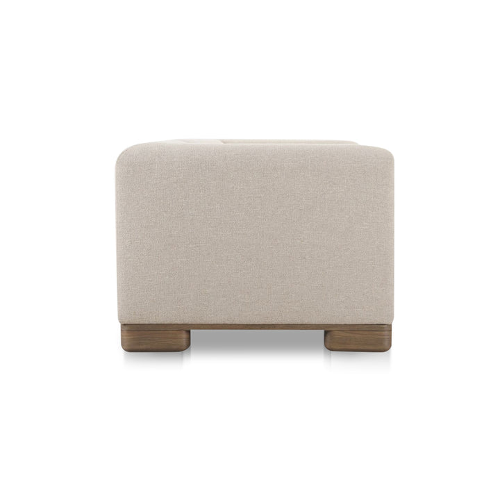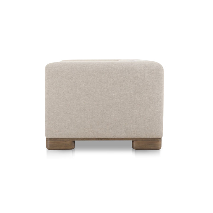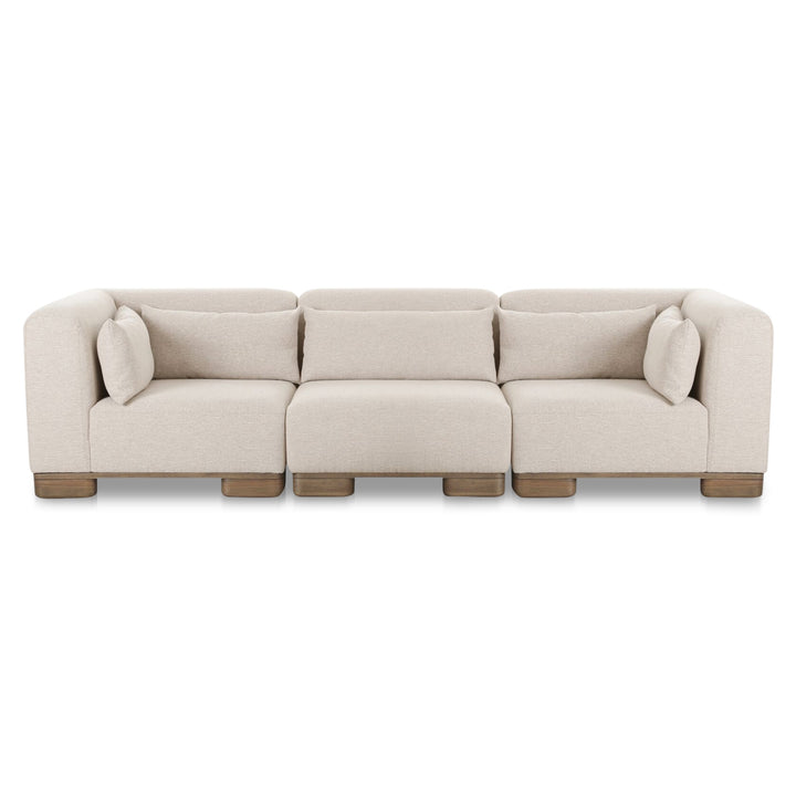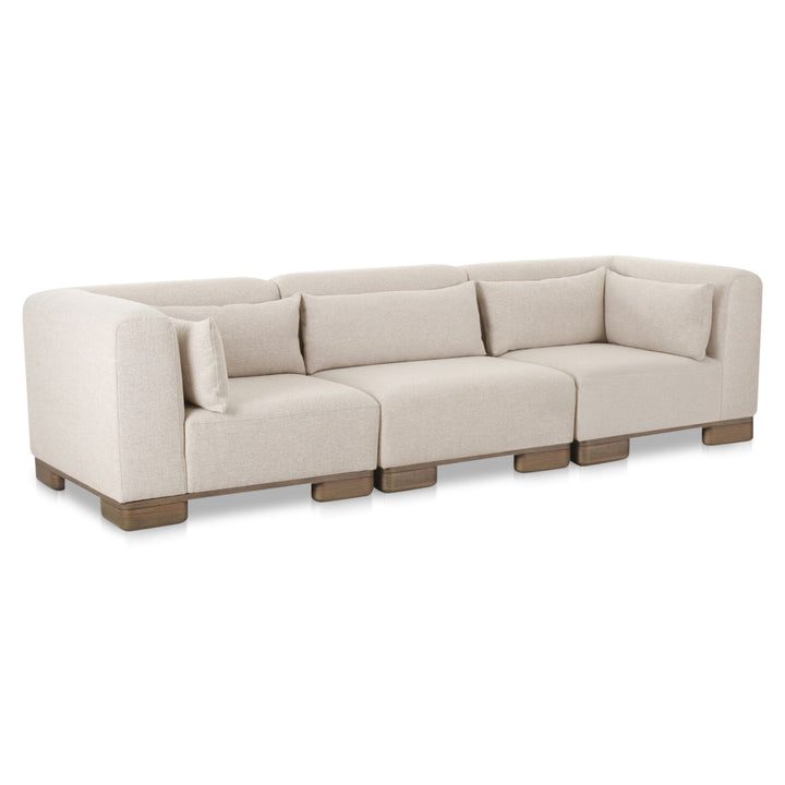 The Nadaal Studios Quinlan Modular Sofa in Oatmeal is a perfect balance of understated elegance and everyday functionality. Wrapped in warm-toned, textured performance fabric, this sofa is upholstered in a durable blend of 72% polyester and 28% acrylic, offering exceptional softness with enhanced durability. The oversized oak veneer base adds a modern, grounded presence, while the solid wood and plywood frame ensures lasting stability. Designed for plush comfort, the foam, feather, and fiber-filled cushions provide a luxurious, sink-in feel. Whether styled as a standalone piece or paired with modular components, the Quinlan sofa effortlessly complements modern and contemporary interiors. Built-in protective leg glides help preserve floors while adding extra support.