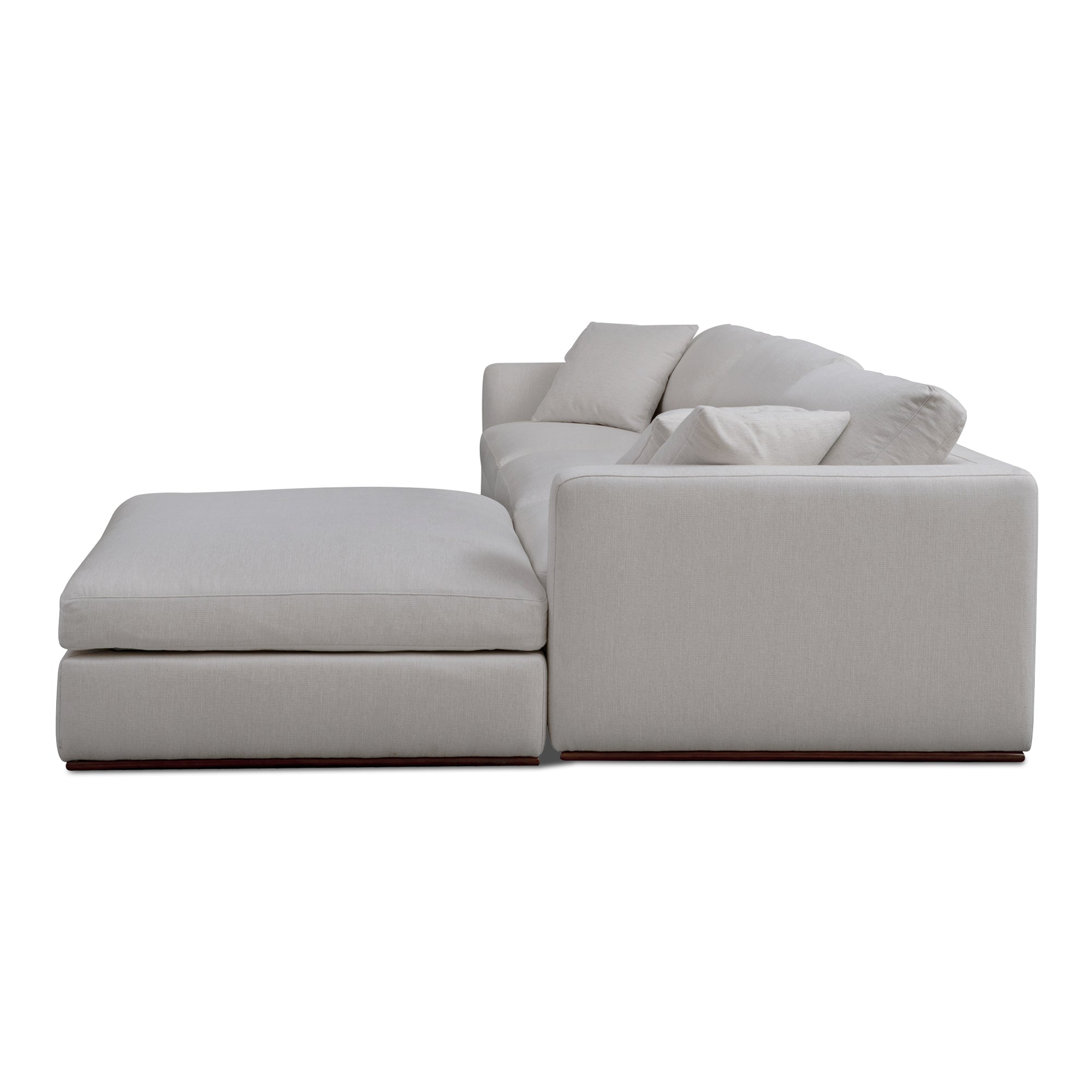 Designed for adaptable comfort and modern elegance, the Rio 4-Piece Modular Sectional from Nadaal Studios brings a luxurious yet airy presence to any space. Composed of two corner chairs, one slipper chair, and an ottoman, this sectional offers multiple configuration options to fit your lifestyle. Its plush bench seats feature a supportive foam core topped with a soft feather-and-fiber blend, ensuring a cloud-like lounging experience. The natural rubberwood accent base and small wooden legs create a floating effect, giving the sectional a sleek, sophisticated look. Complete with removable back cushions and two toss pillows, the Rio Sectional is designed for ultimate relaxation.