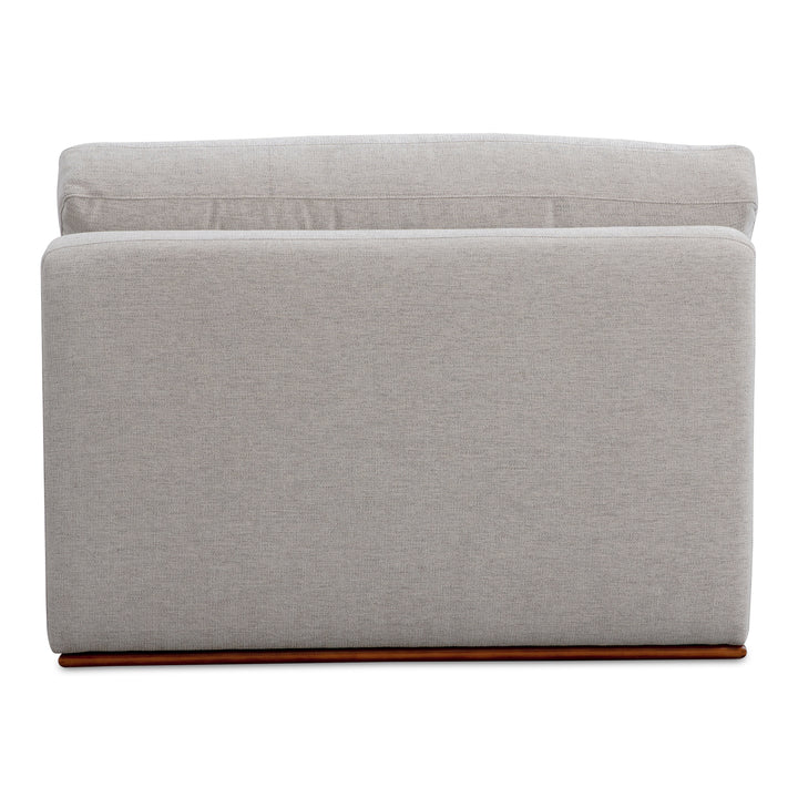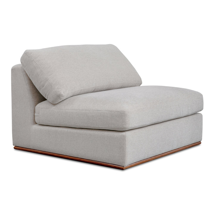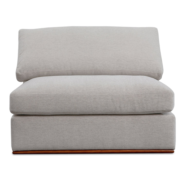 The NADAAL STUDIOS Rio Slipper Chair offers versatile seating with a touch of modern elegance. Designed with a rubber wood accent base and small wooden legs, this chair creates a sleek, floating appearance. Upholstered in soft flecked grey fabric, it features removable back cushions and a plush bench seat filled with a 70% feather and 30% fiber blend for superior comfort. A foam core adds durability and ensures long-lasting shape retention. Whether used as part of a modular setup or as a standalone piece, this slipper chair combines function and sophistication, arriving fully assembled for effortless use.