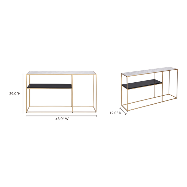 Riven Console Table, Contemporary Style, Gold-Finished Iron Frame with White and Black Marble Shelves