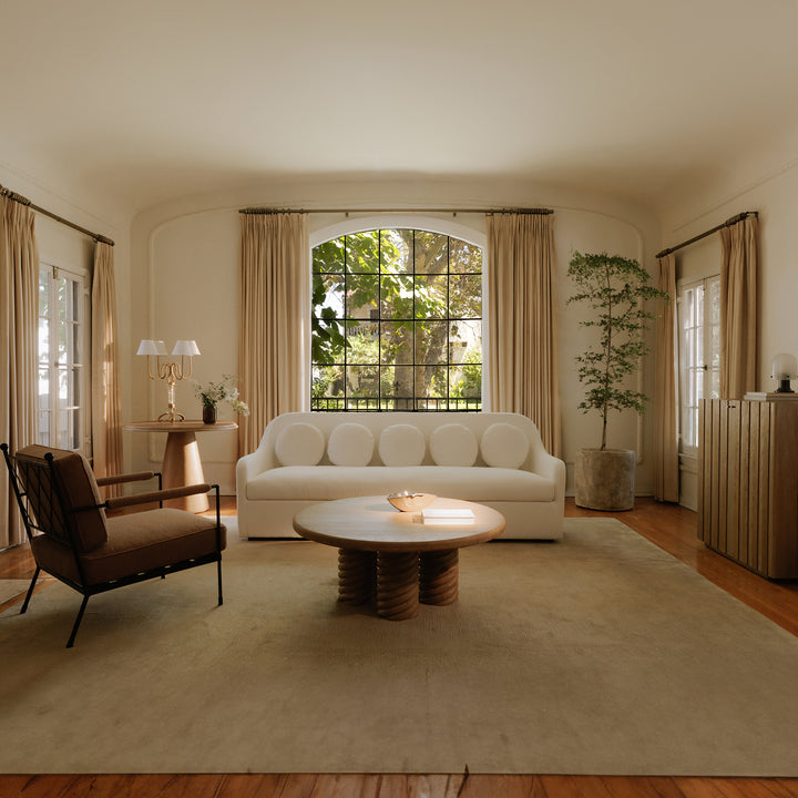 A playful take on modern sophistication, the Rialto Sofa from Nadaal Studios pairs a high, curved backrest with five unique circular toss cushions. Upholstered in soft, OEKO-TEX certified performance fabric, this piece is both environmentally conscious and family-friendly. A feather and fiber fill delivers all-day comfort, while the high curved back and bench seat create an inviting sculptural presence. It’s whimsical, versatile, and undeniably stylish.