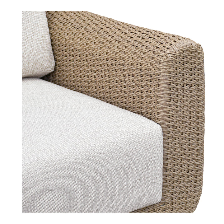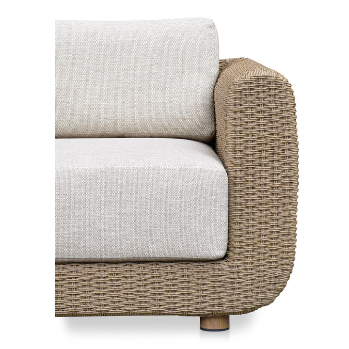 A blend of natural textures and modern outdoor durability, the Nadaal Studios Salem Outdoor Corner Chair in Natural Wicker is the perfect seating solution for patios, gardens, and balconies. Featuring a PE synthetic wicker frame in a soft natural finish, this chair is both stylish and built to withstand the elements. The Olefin sunproof fabric cushions, paired with quick-dry foam, ensure lasting comfort and weather resistance. Designed with curved arms and an aluminum frame, this corner chair offers a spacious and inviting seat for outdoor lounging. Whether styled as a standalone piece or combined with the Salem collection, this chair creates a serene and sophisticated outdoor retreat.