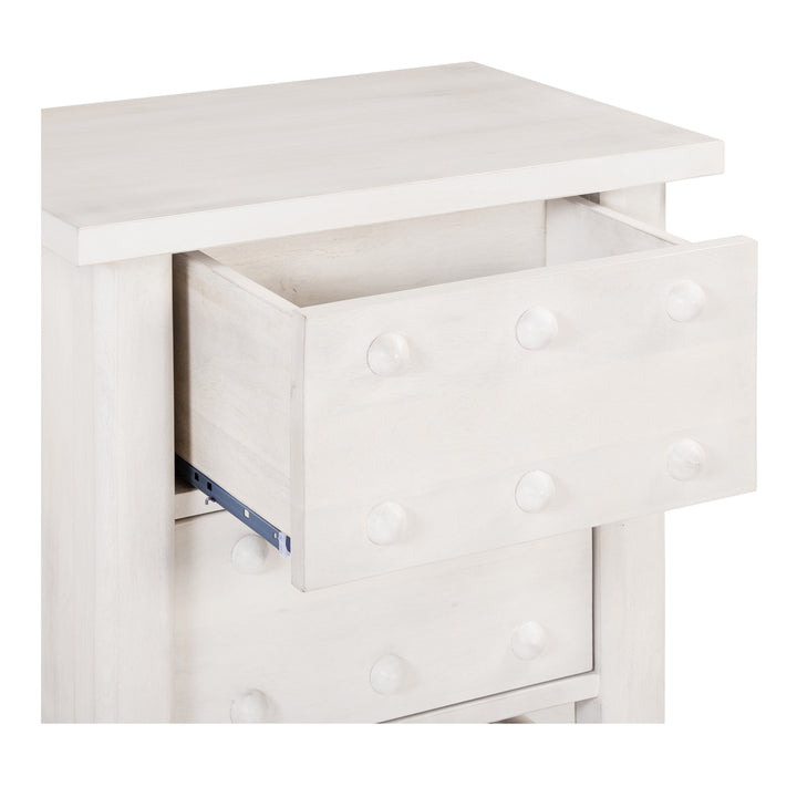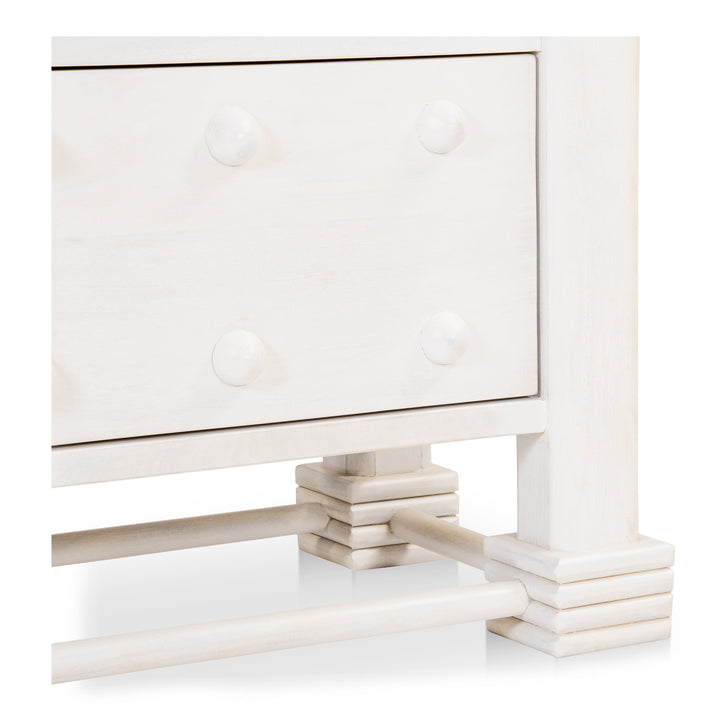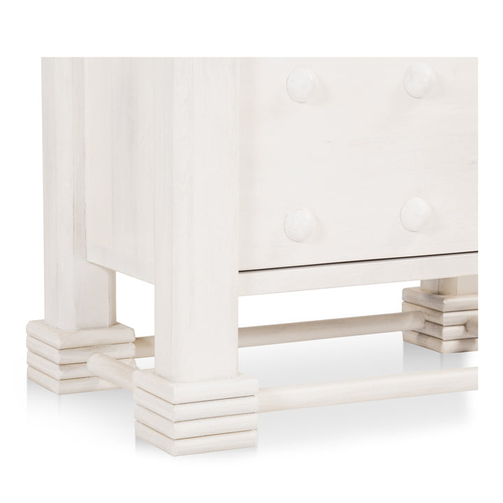 The Shiloh Nightstand by Nadaal Studios is a timeless blend of French-inspired artistry and practical functionality. Made from sustainably sourced mango wood, this nightstand showcases hand-carved details, stacked feet, and intricate circular motifs on the drawers. The whitewashed finish enhances the wood’s natural beauty, bringing an airy, elegant aesthetic to your bedroom. Featuring push-to-open drawers, Shiloh offers seamless storage while maintaining its refined, minimalist look. A perfect companion to any bedside, it’s crafted to add character and charm to your space.