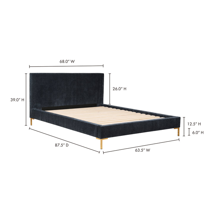 Discover the epitome of refined elegance with the Skylar Bed from NADAAL STUDIOS, where the convergence of modern functionality and timeless design creates more than just a place to rest - it crafts an experience. Each element, from the luxuriously soft midnight blue velveteen fabric that wraps the solid pine frame, to the meticulously foam-padded headboard and striking golden leg accents, has been thoughtfully selected to offer supreme comfort and a distinguished aesthetic. The Skylar Bed not only serves as the focal point of your bedroom but also embodies our commitment to crafting furniture that elevates your living spaces. With supportive slats that ensure a stable and comfortable sleep, and a design that requires no box spring, this bed is both practical and sophisticated. Simple assembly and easy care instructions ensure that your focus remains on enjoying the serene beauty and luxurious comfort of your bed, making every night a restful retreat.