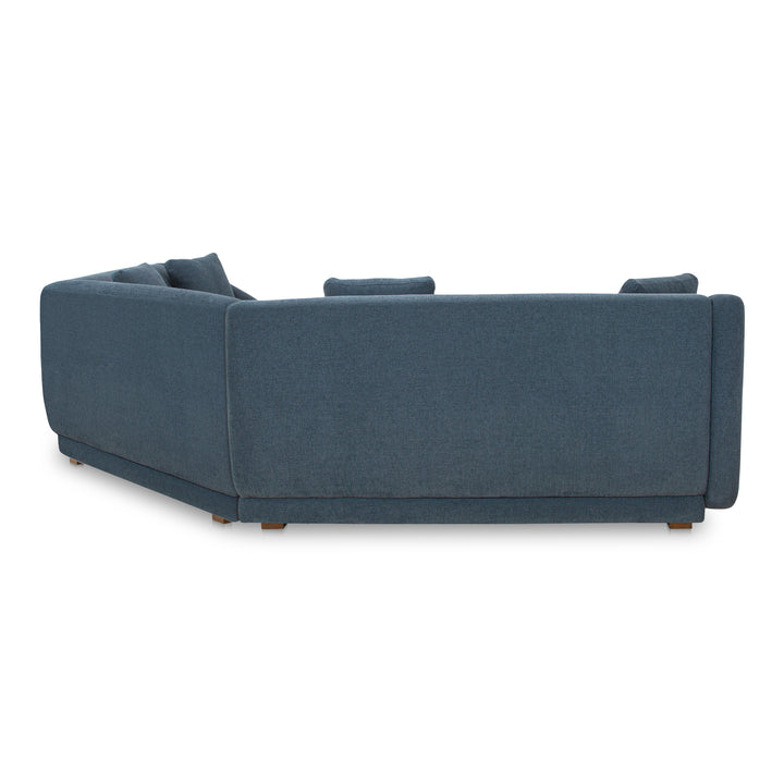 Clean lines and comfort collide in the Solace 5-Seater Modular Sectional—a thoughtfully designed piece that fits seamlessly into smaller spaces without sacrificing style. Anchored by a low-profile plinth base and wrapped in a deep blue, high-performance fabric, this modular design features gently angled sides and sloped arms for a visually softened, modern silhouette. With plush foam and fiber filling supported by a durable beech and plywood frame, this piece is designed to transition from everyday lounging to weekend hosting with effortless grace.
