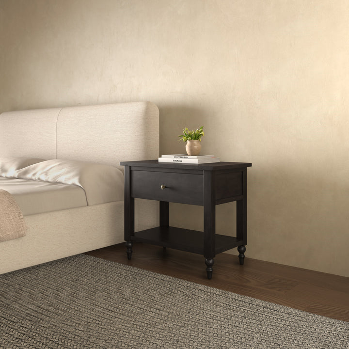 Stellan Nightstand, Acacia Veneer and Brass Handle, Single Drawer, Black