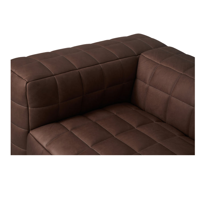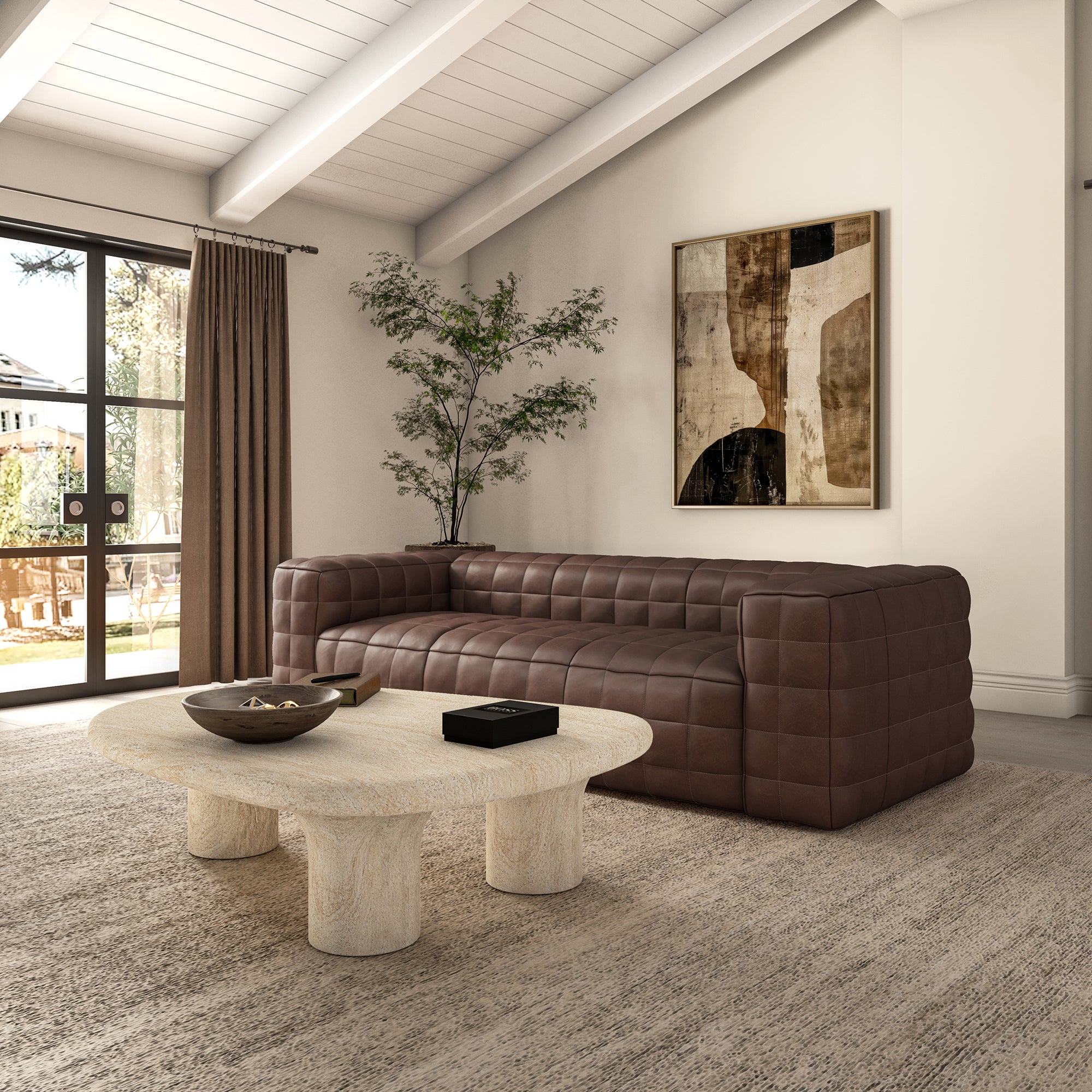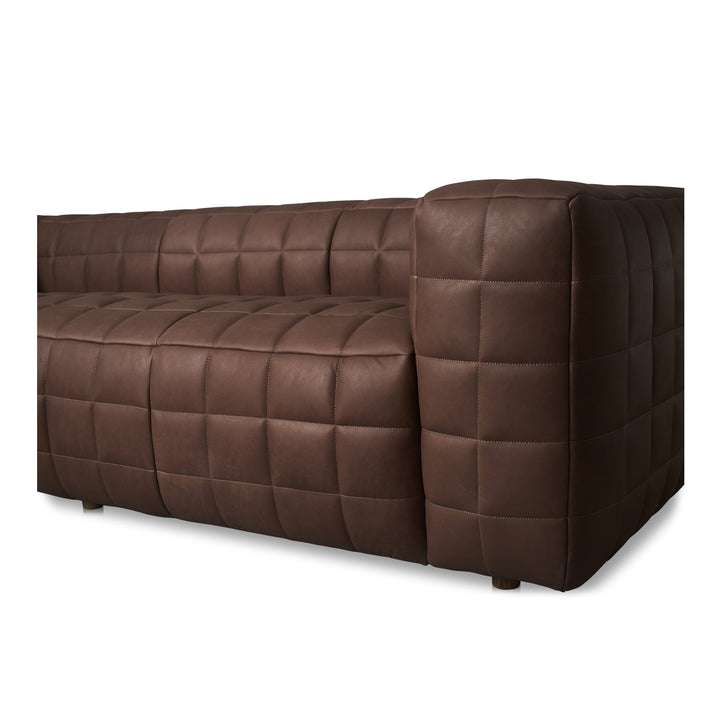 Introduce understated elegance to your living room with the NADAAL STUDIOS Sylvana Sofa. Upholstered in full aniline leather with a rich dark brown finish, this sofa exudes timeless charm. The wide arms, low profile, and generously sized bench seat make it as comfortable as it is stylish. The meticulous grid stitching and contrast detailing enhance its sophisticated aesthetic, while the kiln-dried hardwood frame and elastic webbing suspension provide robust durability. Perfect for those who value both comfort and craftsmanship, the Sylvana Sofa transforms your space into a haven of luxury.