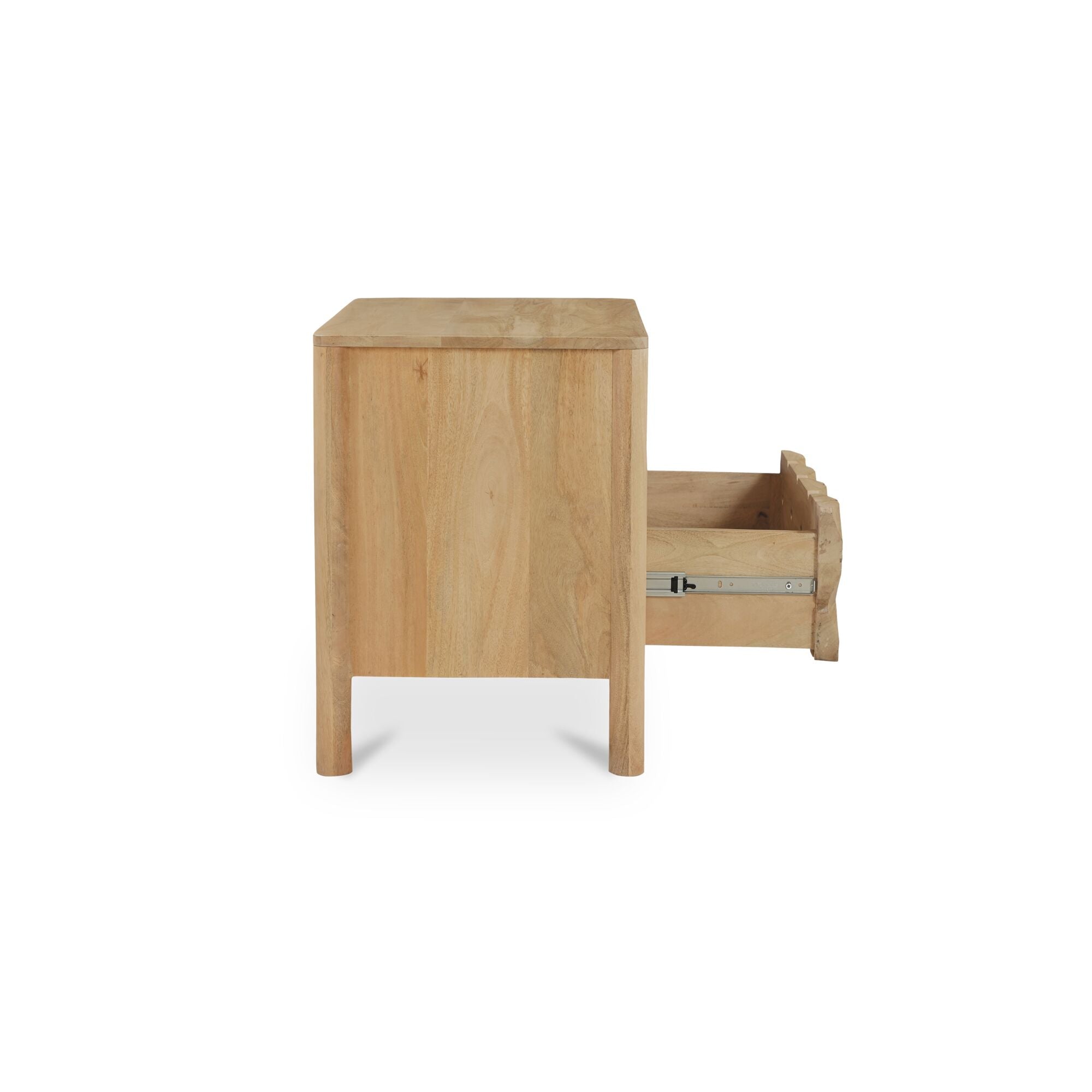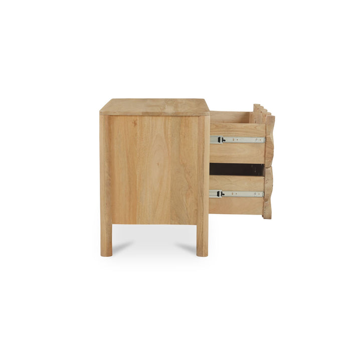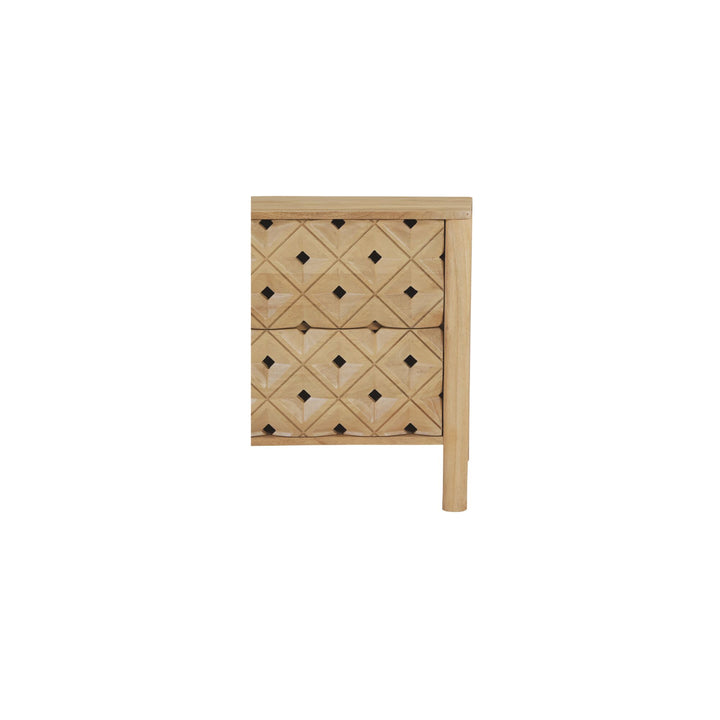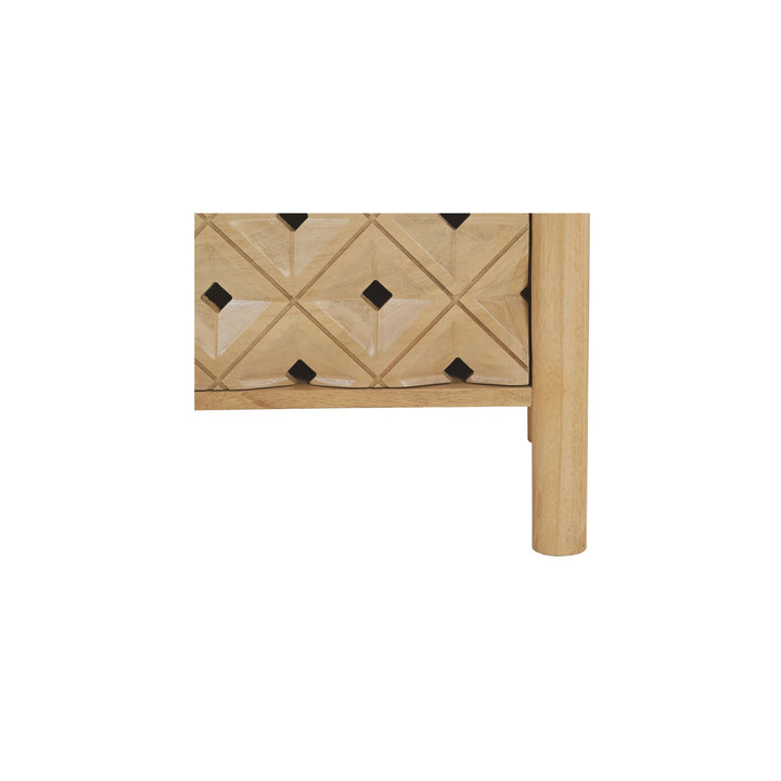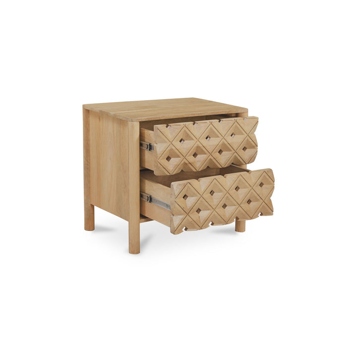 Talric Nightstand, Geometric Carved Mango Wood, 2-Drawer, Push-to-Open, Natural Finish