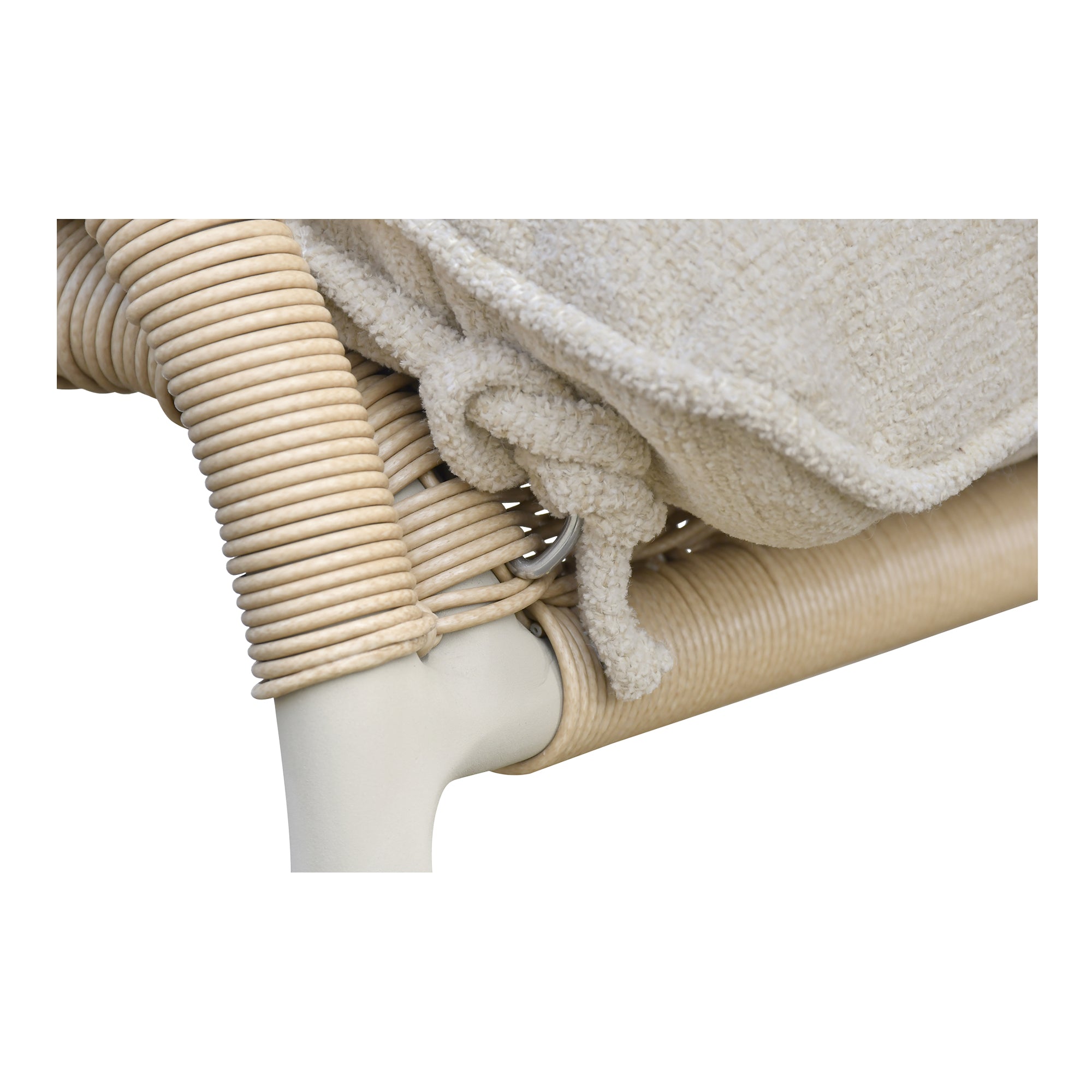 Relaxation meets timeless craft with the Torven Outdoor Rocking Chair by Nadaal Studios. The curved silhouette rocks gently on an aluminum frame, supporting a woven synthetic wicker seat filled with Dacron fiber and finished with a plush beige cushion made from solution-dyed polyester. O‑rings easily attach the cushion to the frame—or allow removal for versatile styling. Built for outdoor peace and refined relaxation.