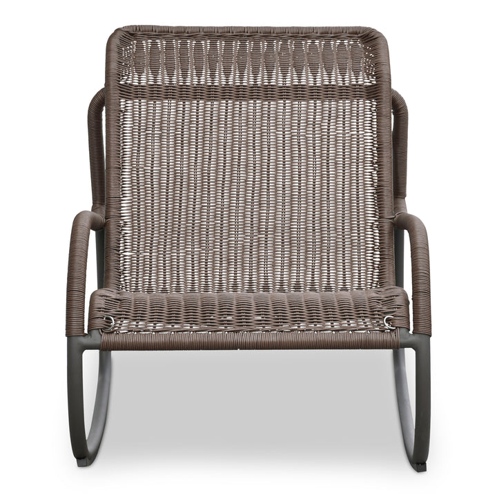 Elevate your outdoor lounge experience with the Torven Rocking Chair in Brown by Nadaal Studios. Its streamlined aluminum frame holds a gently curved seat made from woven synthetic wicker and cushioned with plush brown fabric fiber. Detachable via O‑rings, the cushion offers both flexibility and comfort. Deft at bringing rhythm and texture to alfresco spaces, Torven balances natural visual warmth with outdoor resilience.
