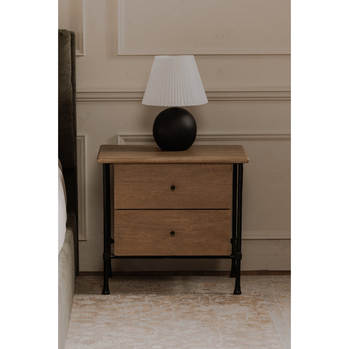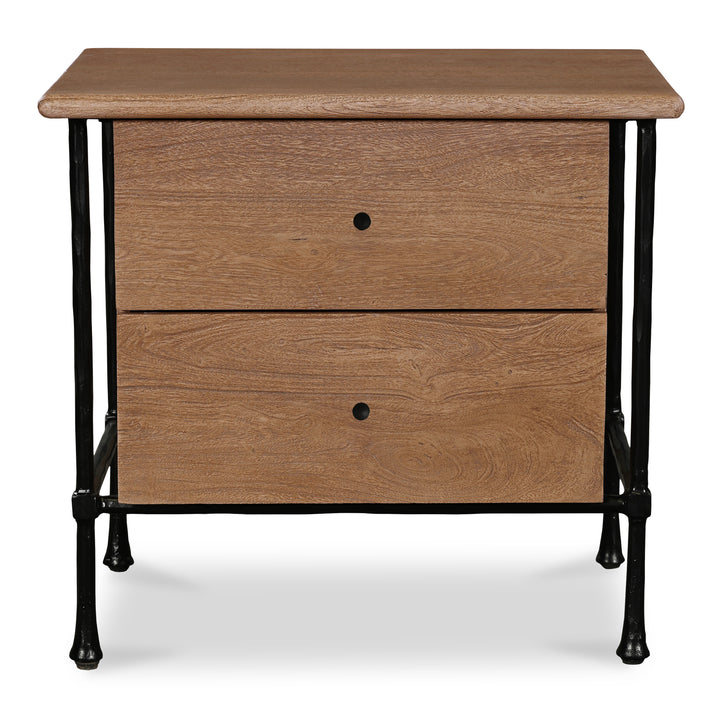 Valenor Nightstand, Solid Acacia Wood with Hammered Iron Base and Traditional Beveled Details, Brown